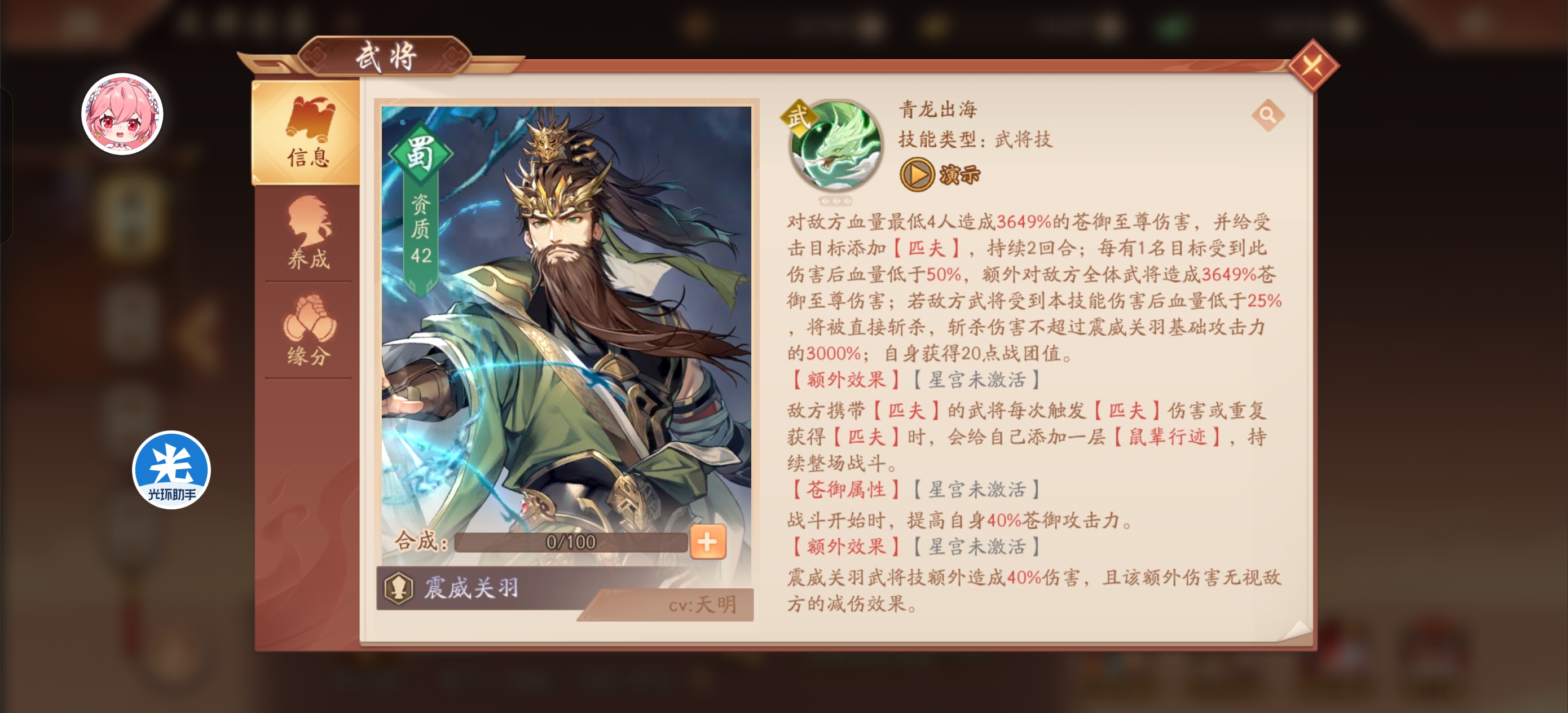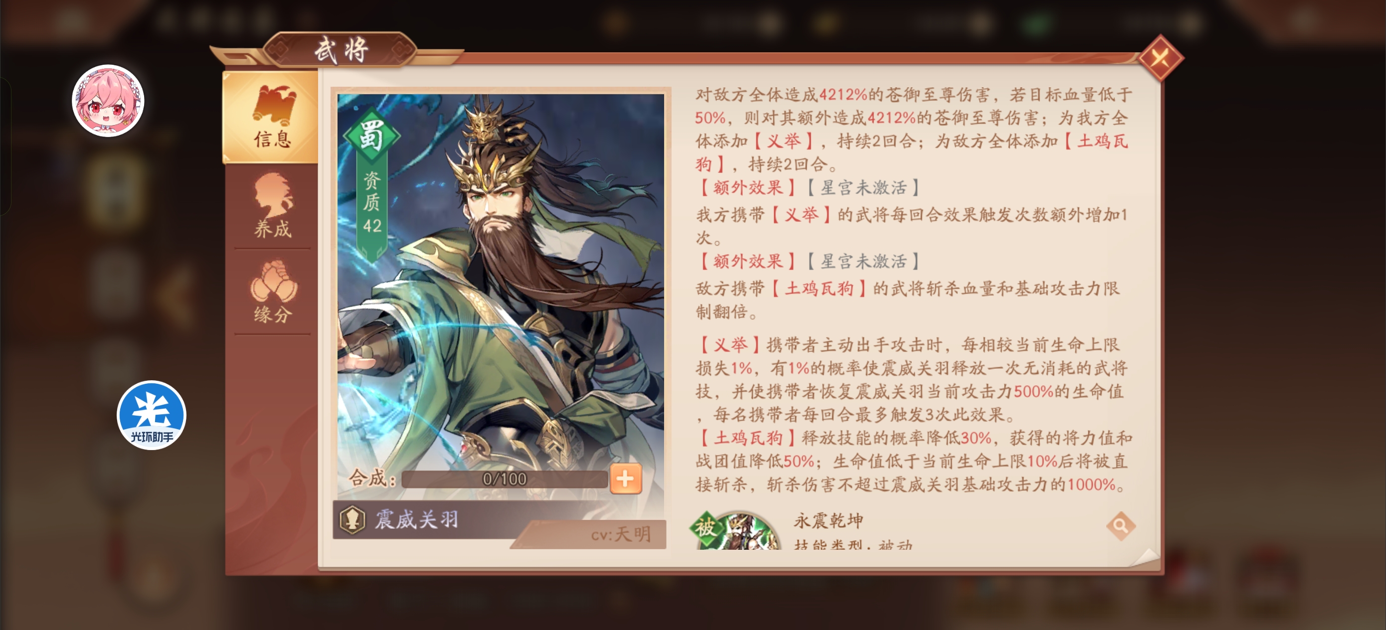 震威关羽的同排友军每次主动出手时会使震威关羽获得数点【龙魂】。