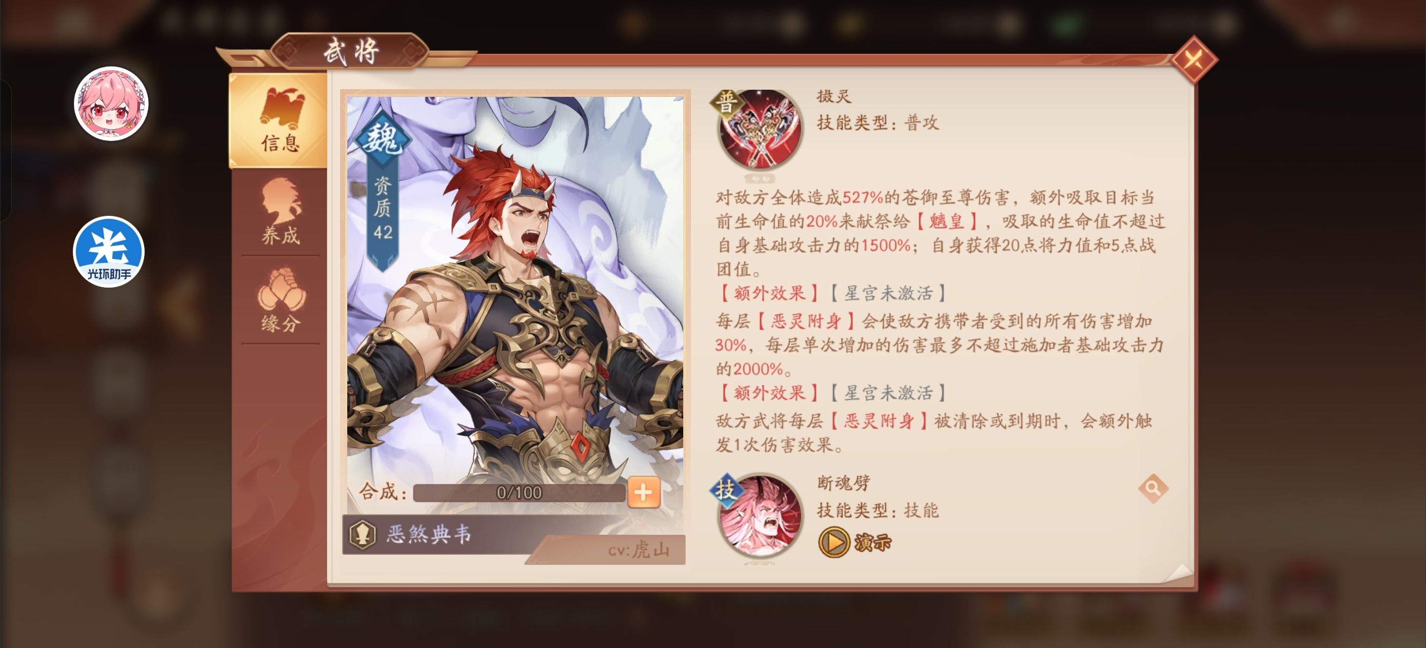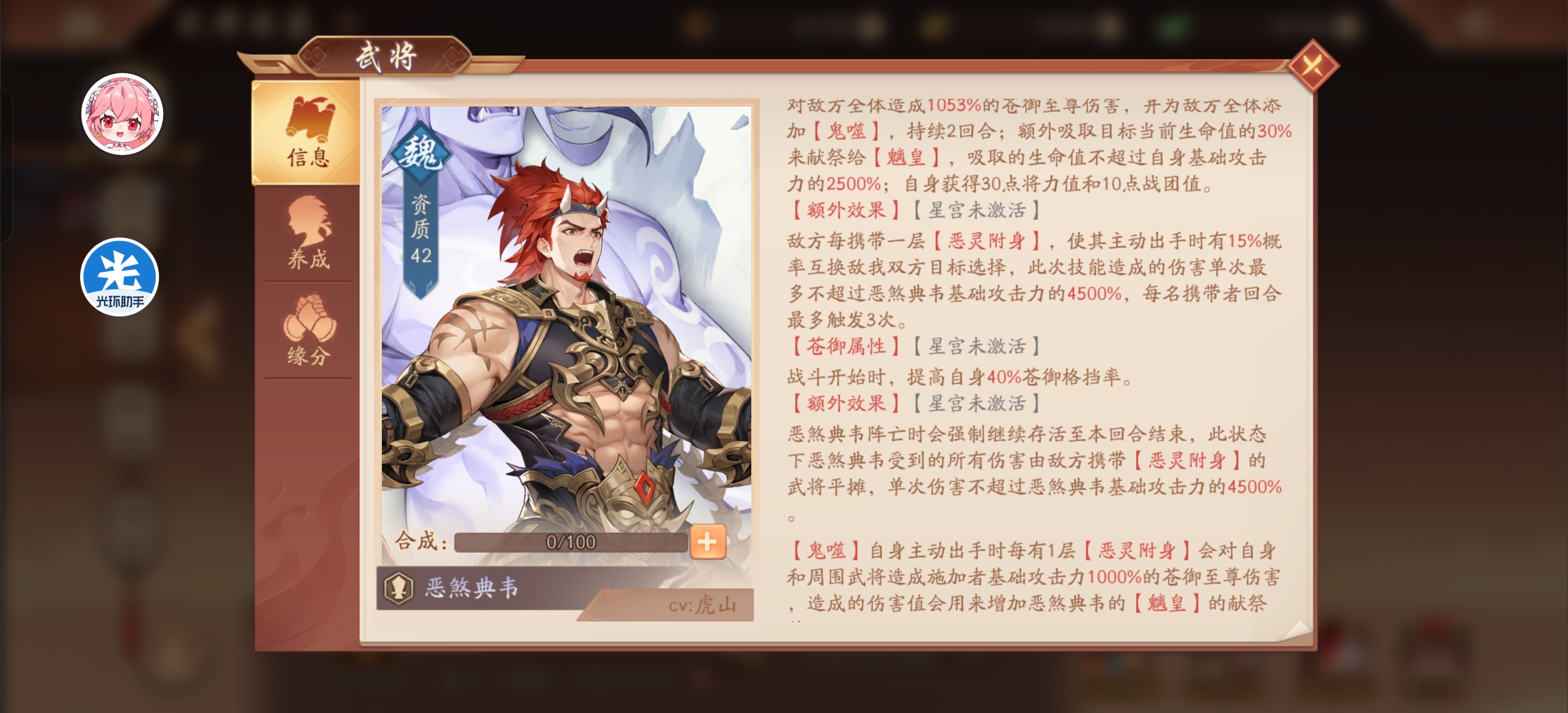 自身主动出手时每有1层【恶灵附身】会对自身和周围武将造成施加者基础攻击力一定比例的苍御至尊伤害,造成的伤害值会用来增加恶煞典韦的【魑皇】的献祭值。