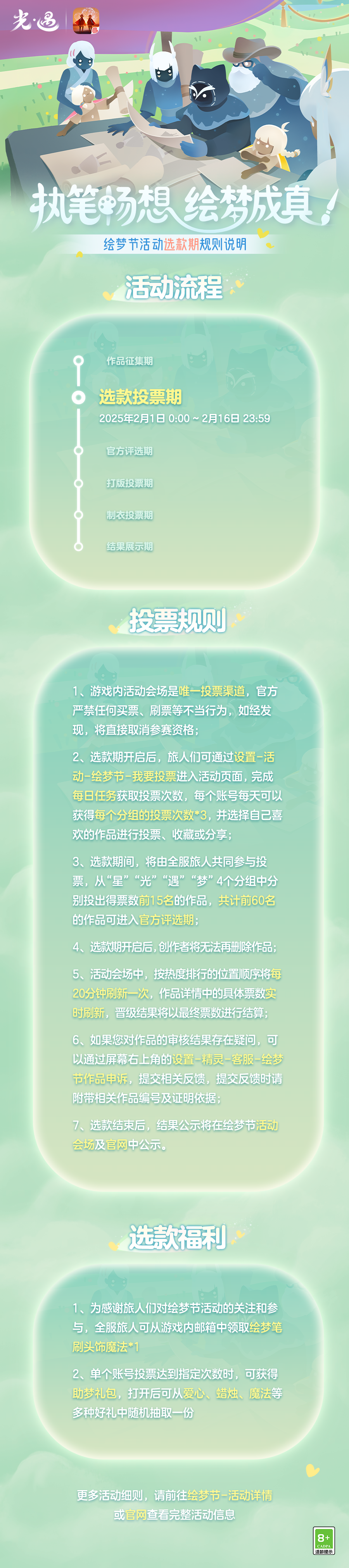 创意票选 助力梦想丨《光·遇》绘梦节活动投票规则来啦是泽哦发布于 2025-02-01关注泼墨挥毫,勾勒奇思妙想绘梦节活动已进入选款投票期前往游戏内的活动页面完成每日任务获得投票次数为你心仪的作品助力吧🖌️此外,旅人们可以前往邮箱领取绘梦笔刷头饰魔法*1单个账号投票达到指定次数可随机获得爱心、蜡烛、魔法等奖励更多投票规则请点击图片查看
