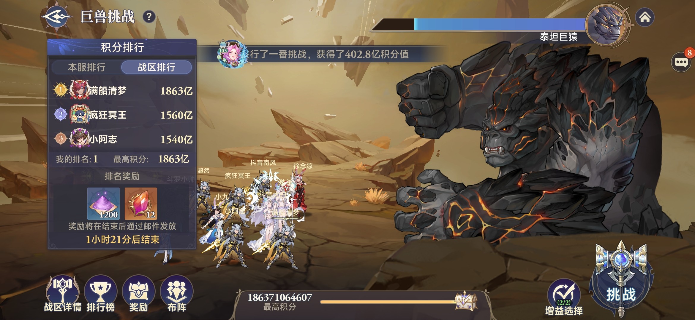 巨兽挑战里有两个BOSS,分别是是天青牛蟒和泰坦巨猿。每次开启的时候会随机出现一个BOSS,两个BOSS的技能是完全不一样的,队伍也不同,天青牛蟒带了两个小弟,而泰坦巨猿是单独BOSS。根据两个BOSS的特点,分析一下怎么围绕修罗小舞组队打高分。
