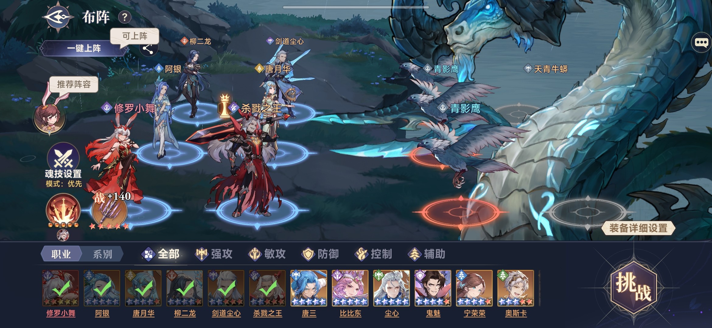 阵容选择:天青牛蟒队伍有3个怪,建议选用群攻阵容。零氪、微氪以唐三、尘心等普通卡为输出核心,配合低星修罗小舞魂技输出。中氪、顶氪以时空队为主,再搭配修罗小舞的追加魂技、追加攻击,斩杀造成真实伤害等输出手段。