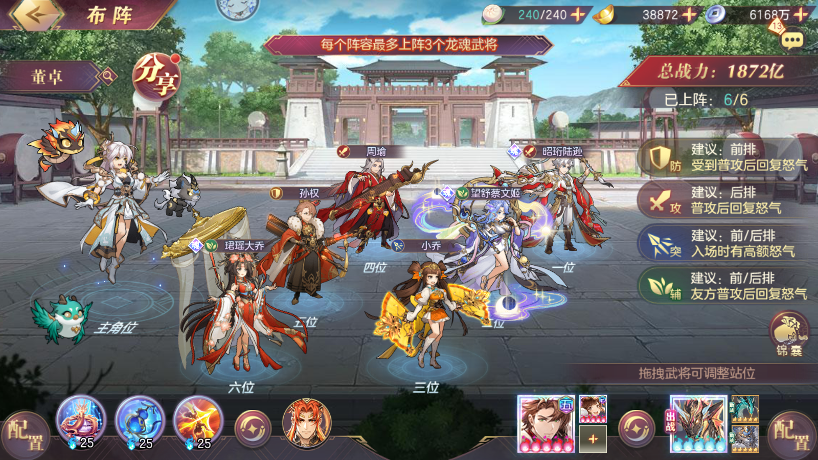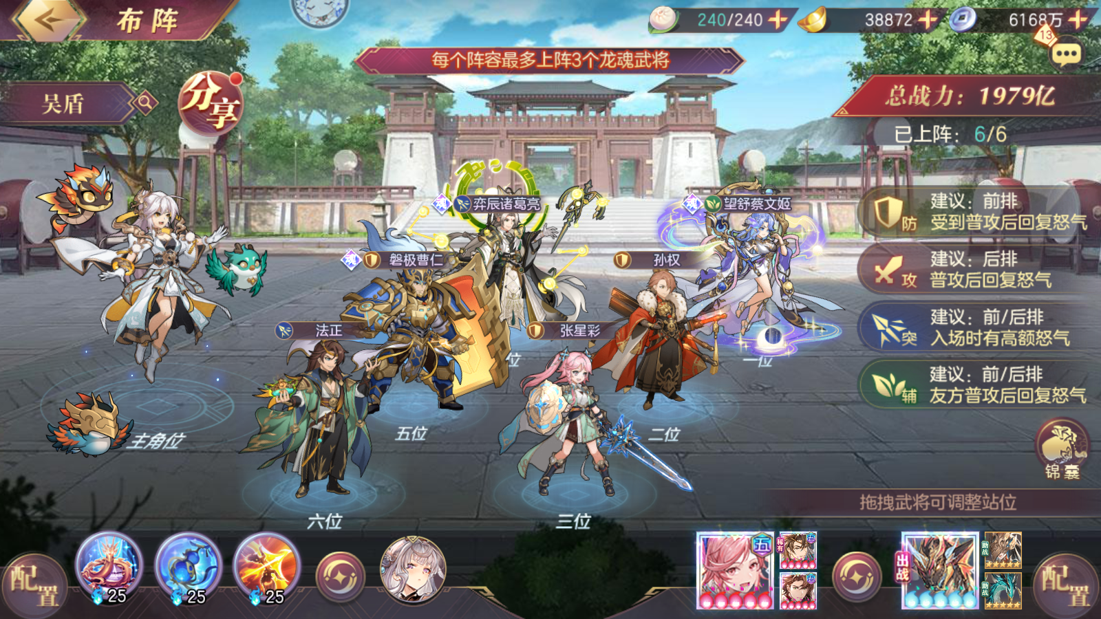 3、盾队:火蛇有个清盾的效果,还克制命魂曹操和夏侯,因此盾队被针对的最惨的队伍,任何配置的盾都无法和满配火烧所抗衡,由于命魂曹操和夏侯的表现不佳,因此不使用这两个武将更换成其他配置还是可以和女团掰掰手腕,总体来说就是谁先手谁的赢面就大。