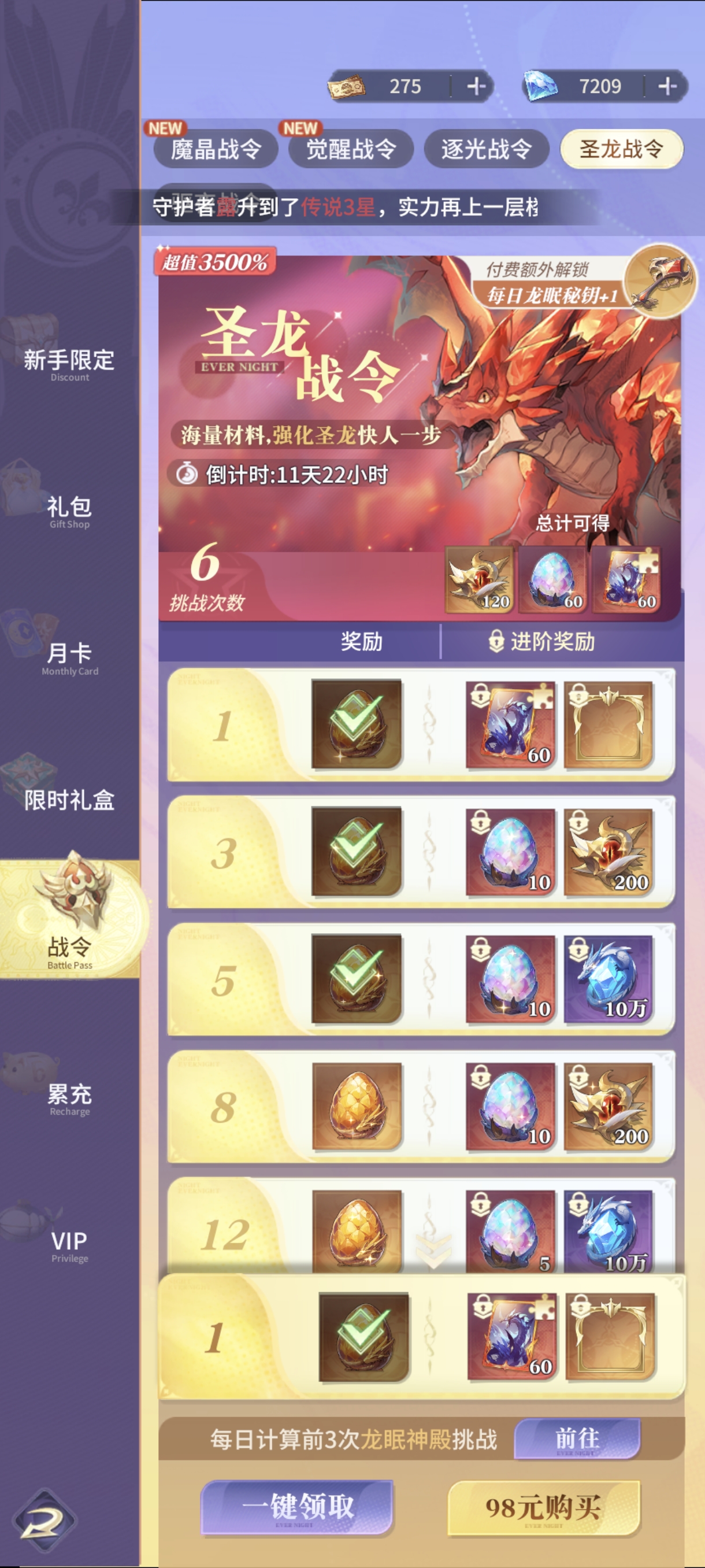 今日氪金点:圣龙战令98+每日特惠18=116块