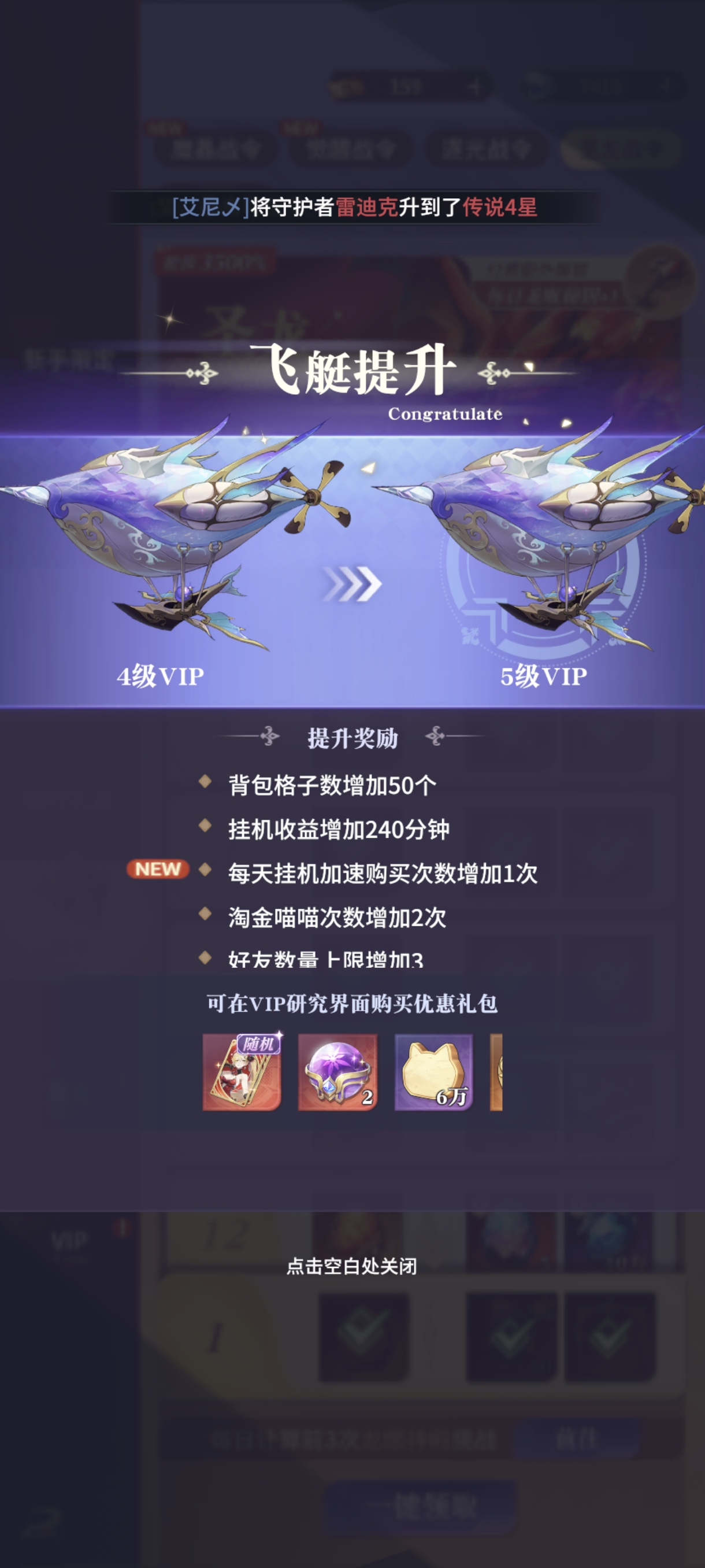 圣龙战令本身虽然不算特别优质,但是购买以后永久每天+1龙眠钥匙,这个可以玩得越久越划算的好东西。氪金后升到VIP5,每天多1次挂机加速和1把龙眠钥匙,购买VIP礼包。