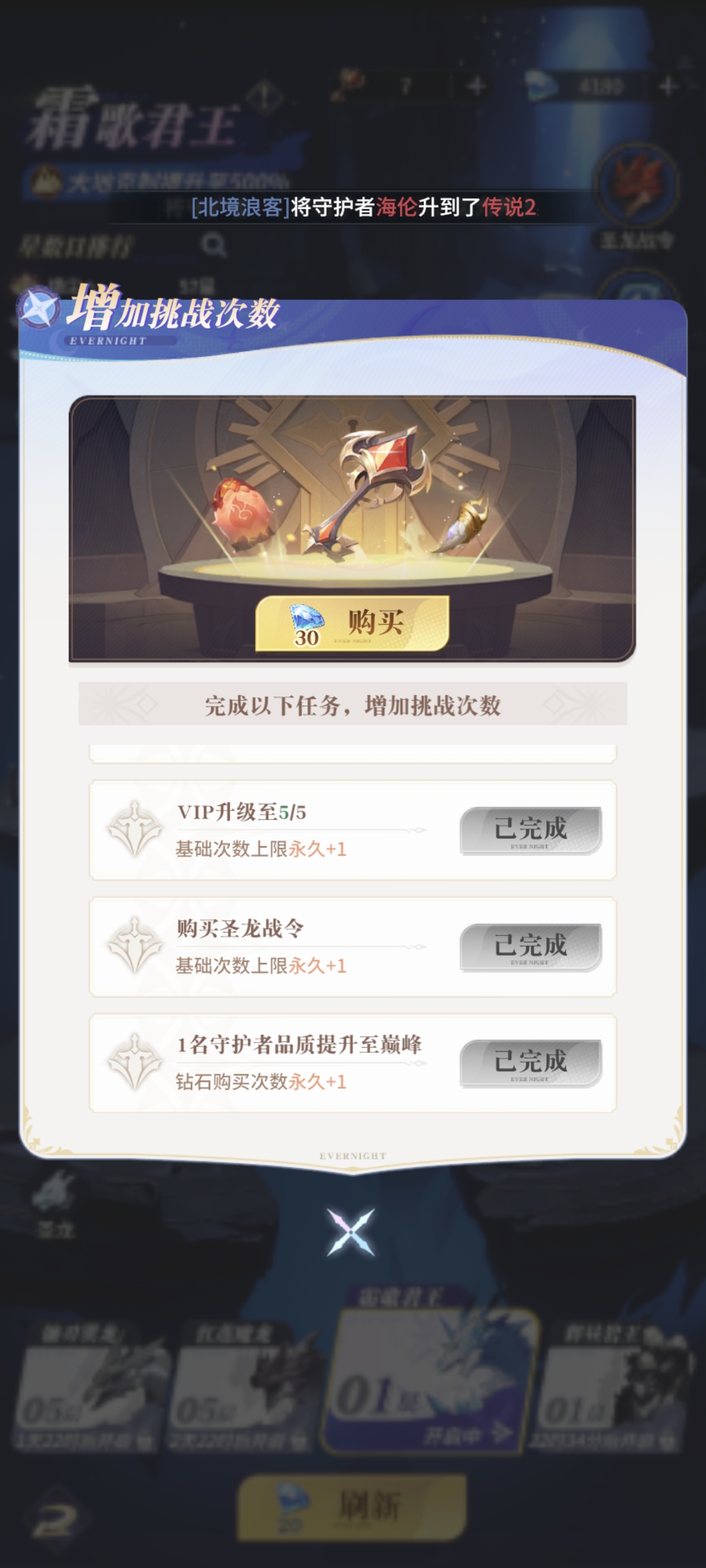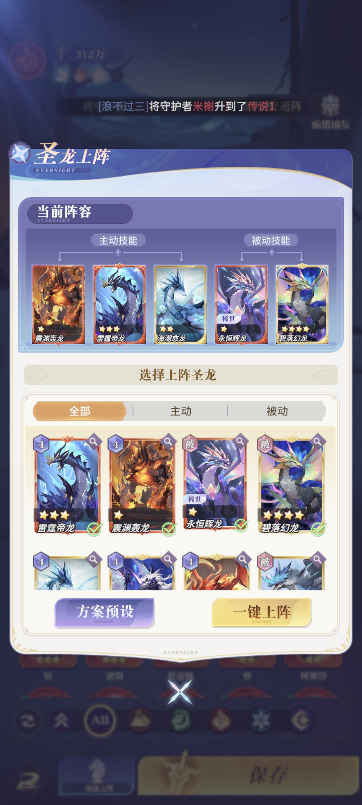 把活动和氪金攒的20个水晶抽+50个圣龙抽+55个高级圣龙抽全部用掉,自选圣龙选震渊+永恒(全体挂易伤和复活),抽到雷霆帝龙和永恒辉龙各一只,雷霆3星是质变,100%眩晕主C,复活有了,实战强度大涨。