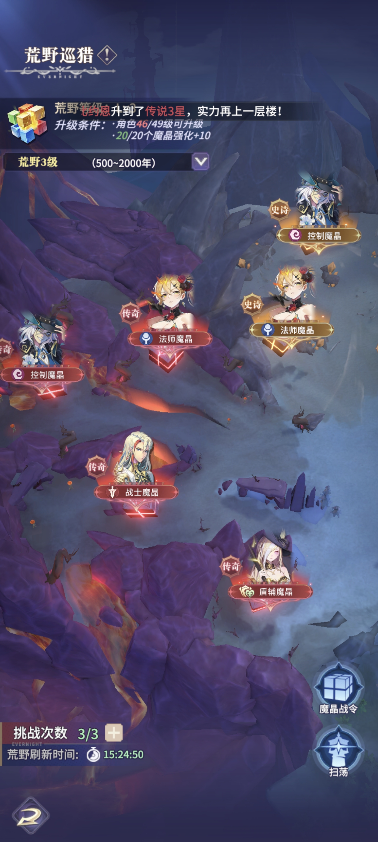 挂机升到45级,把主线第八章推完,荒野巡猎主要补一下盾辅的魔晶(因为两职业共用而且辅助人数多),魔晶强化到全员+15,主C+20。