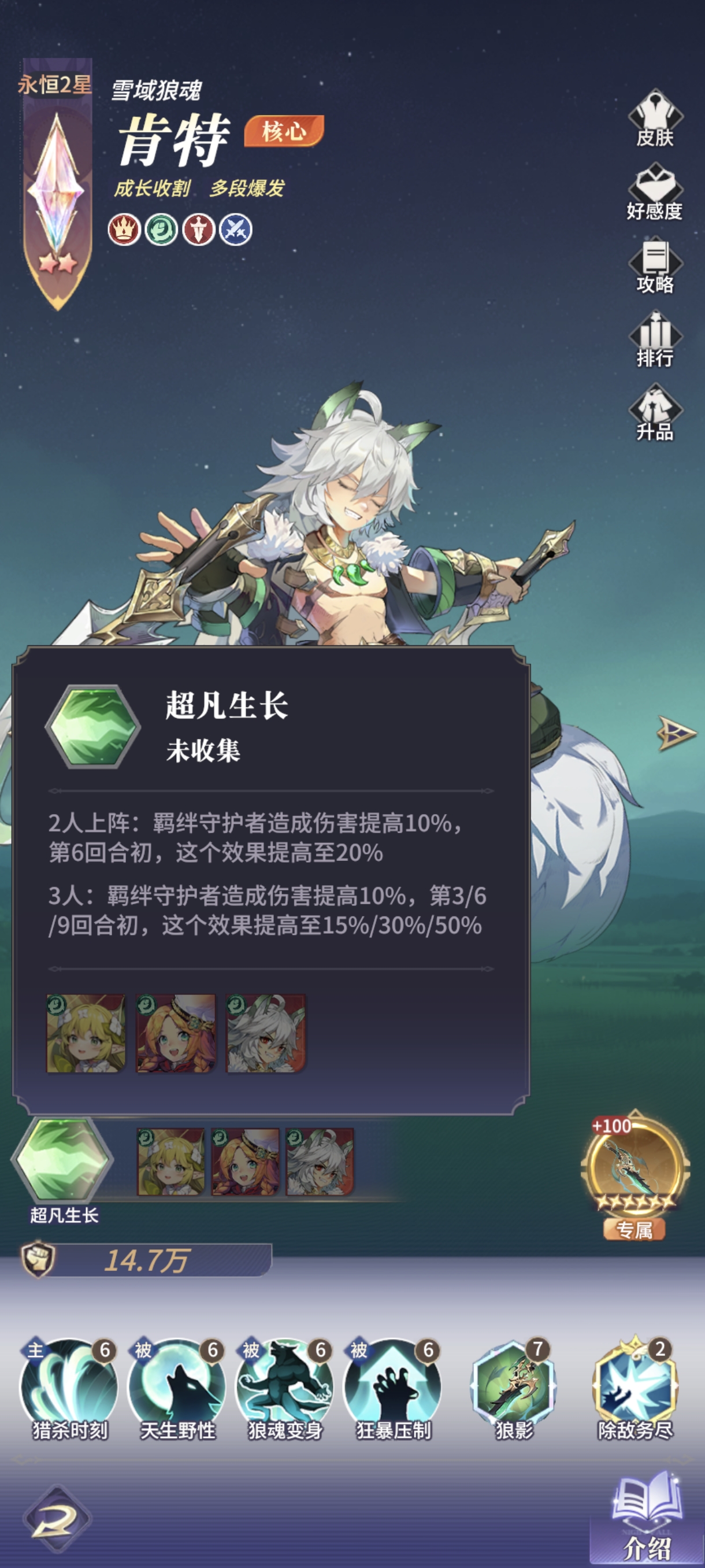 狼王成长流是以狼人自身特性和羁绊【超凡生长】为核心,随着战斗回合获得超高的属性成长,其他英雄只要能保住狼王活到9回合,狼王就能单人收割的输出模式。