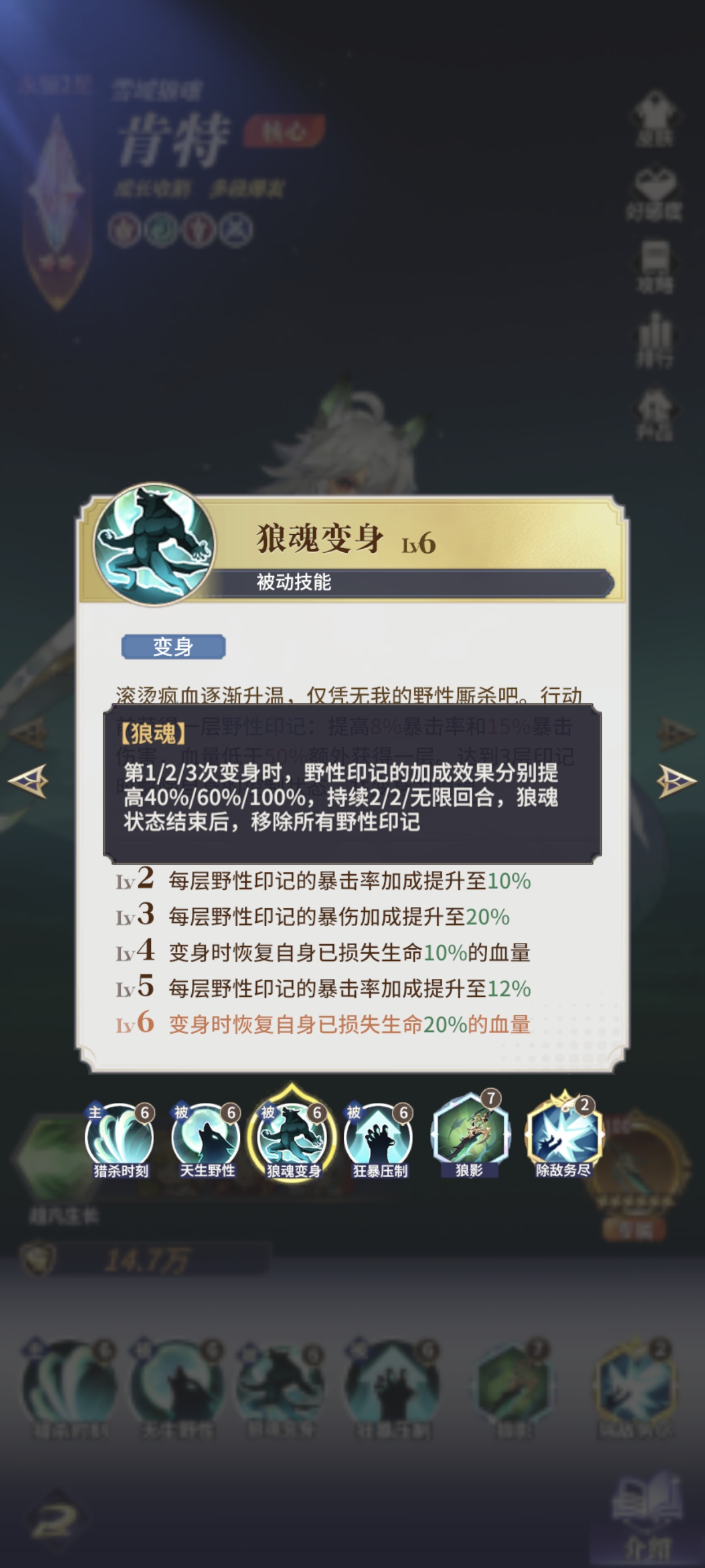狼王的第二个爆发期(最终爆发)是在第9回合以后,【超凡生长】的增伤提高至50%,第三次变身后野性印记效果翻倍并持续永久,狼王将获得高达72%暴击+120%暴伤的恐怖加成。
