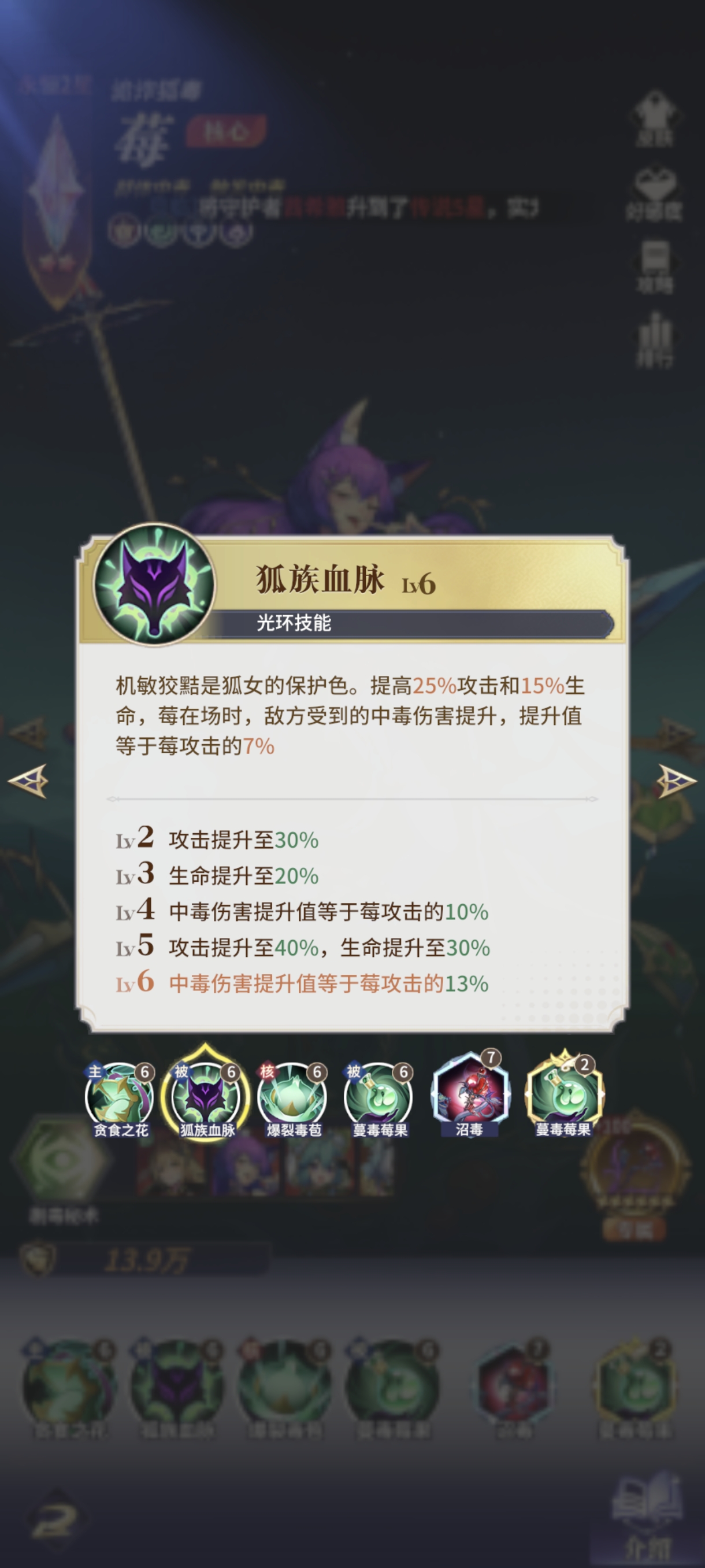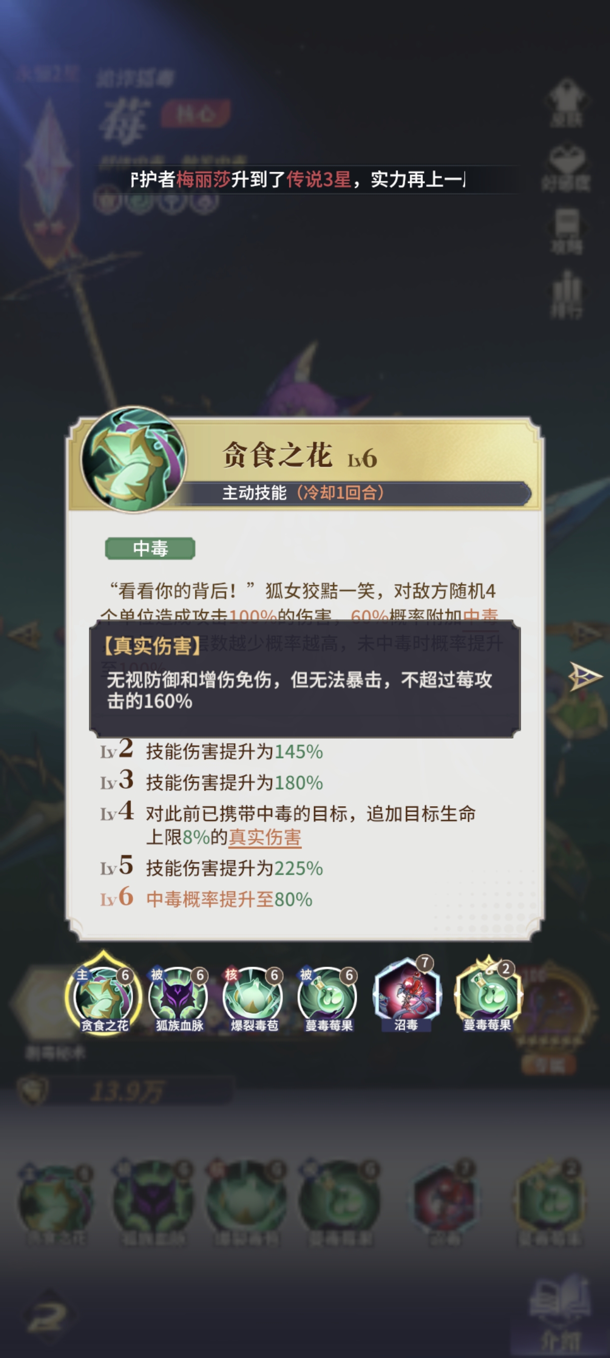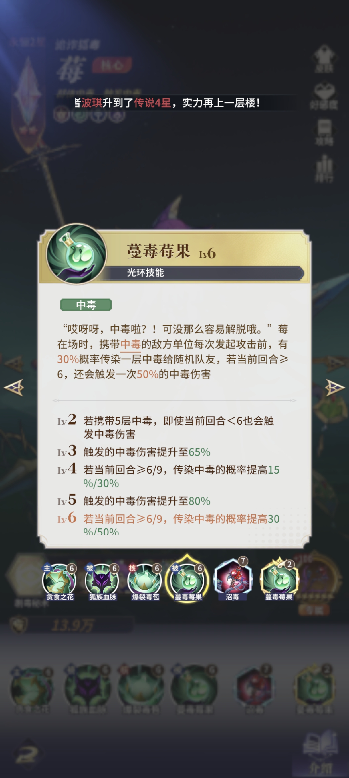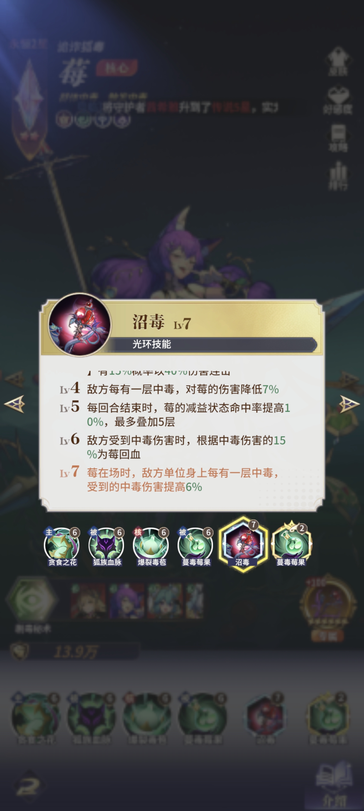 莓作为阵容主C上阵,她除了上面提到的传染和追加真伤能力外,还能被动提升敌方中毒的伤害。并且随战斗回合成长减益命中,增加叠毒的稳定性,随敌方中毒层数增加毒伤,越毒越疼。