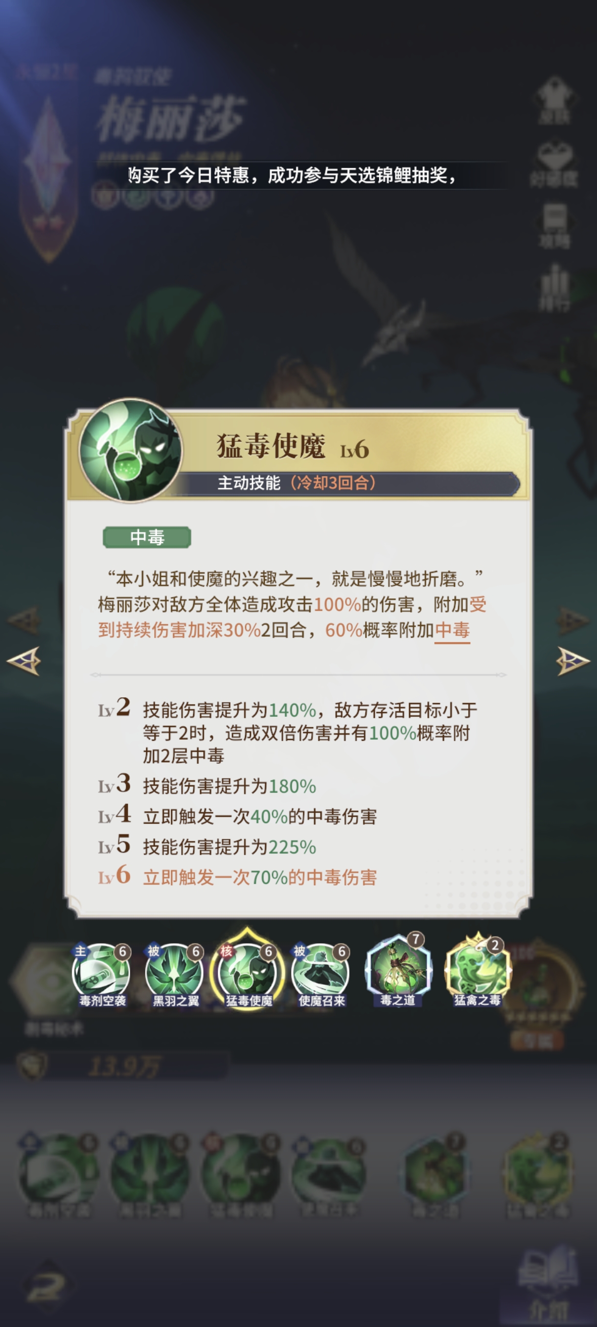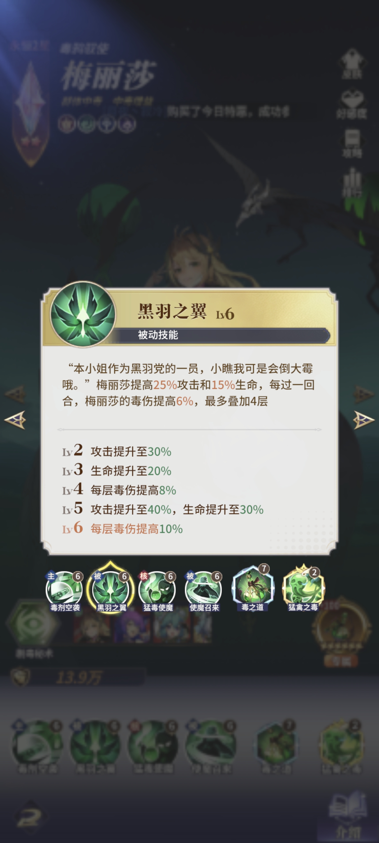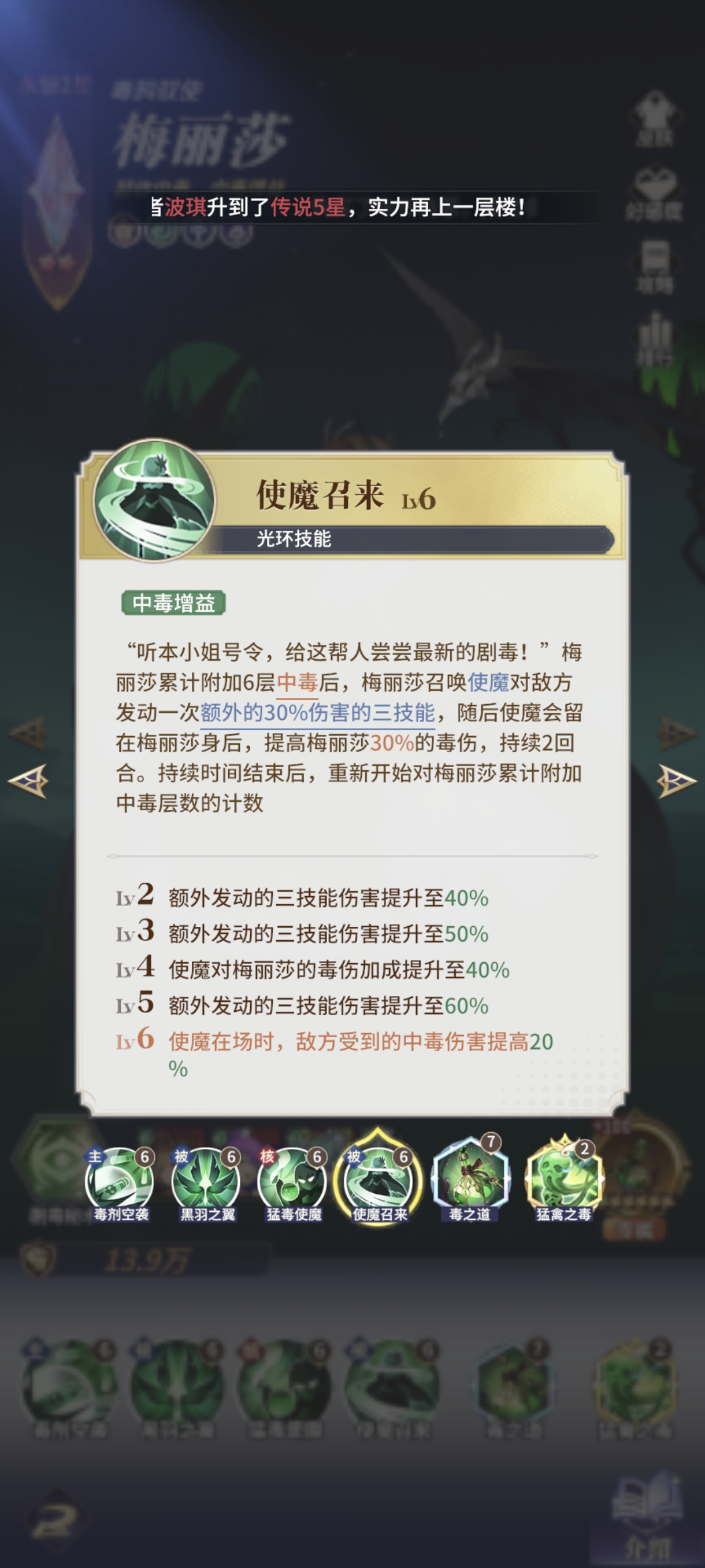 梅丽莎是毒队的第一个核心,她的毒拥有极高成长性,4回合后被动+40%毒伤,大招后+50%持续伤害加深,使魔在场再+30%毒伤,敌方+20%受毒伤害,全部加起来毒伤翻倍都不止,对队友毒伤的提升也非常巨大。
