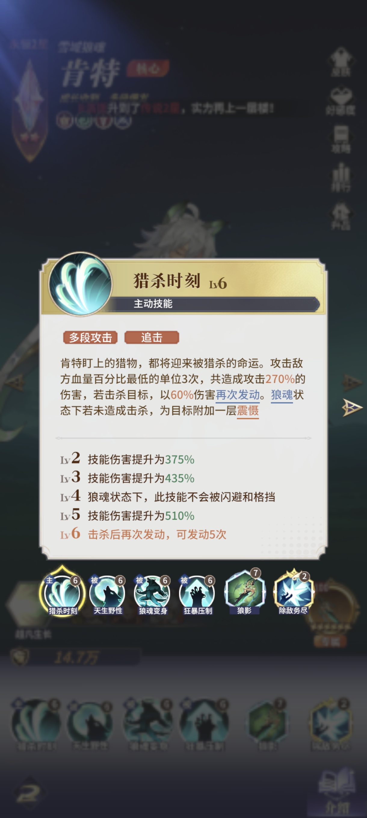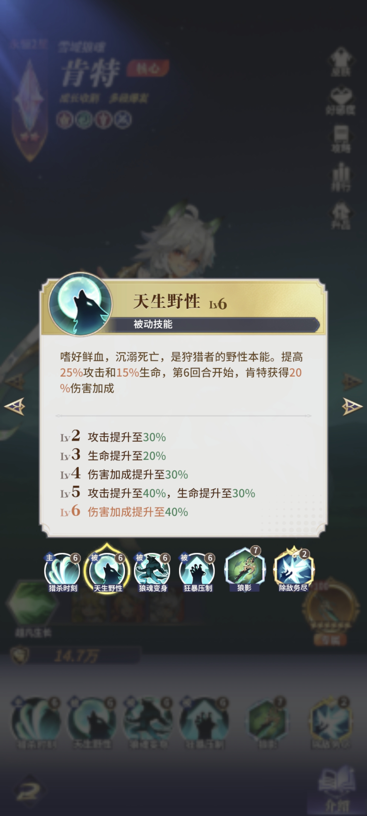 狼王自身天赋在6回合后增伤40%,加上羁绊的30%使狼王必须在6回合之后才能迎来自己的第一个爆发期。