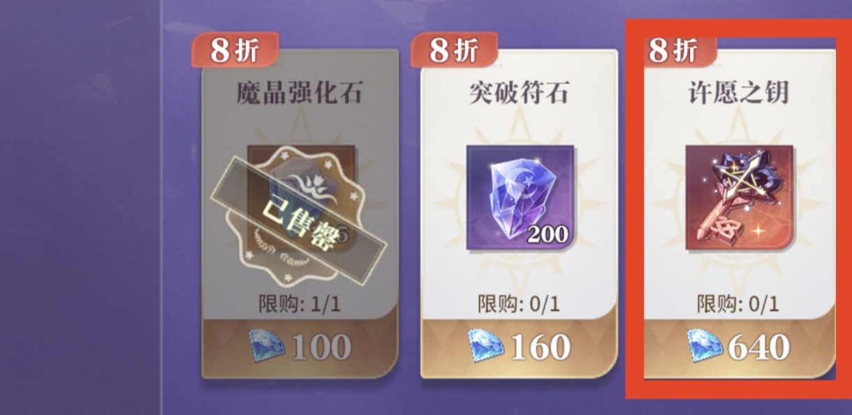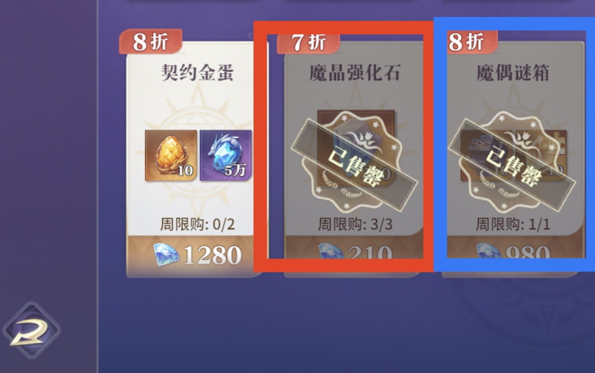 8折魔晶强化石,橙色/红色好感礼物,8折魔偶迷箱可选兑换,其他物品均不推荐兑换。
