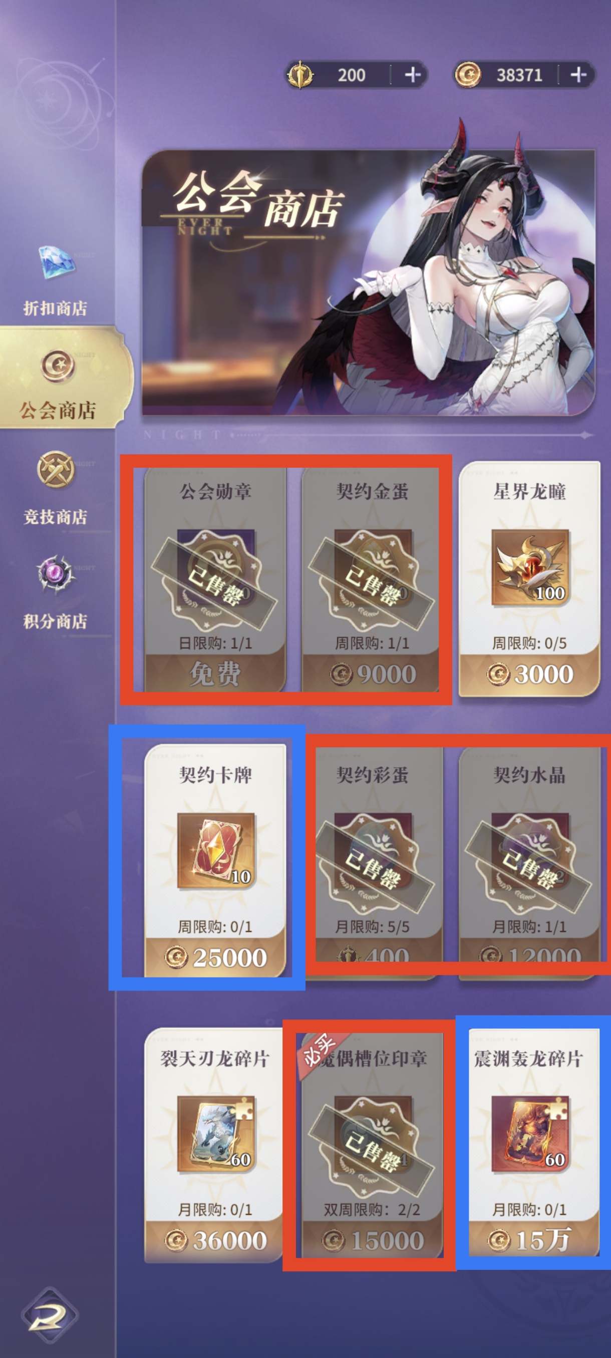 二、公会商店契约金蛋,契约彩蛋,契约水晶,都是抽取核心红卡或圣龙的主要资源,必换。