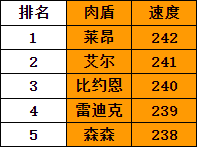 肉盾英雄的整体速度为第一档,即使是最慢的森森也比第二档最快的露更快15点以上。