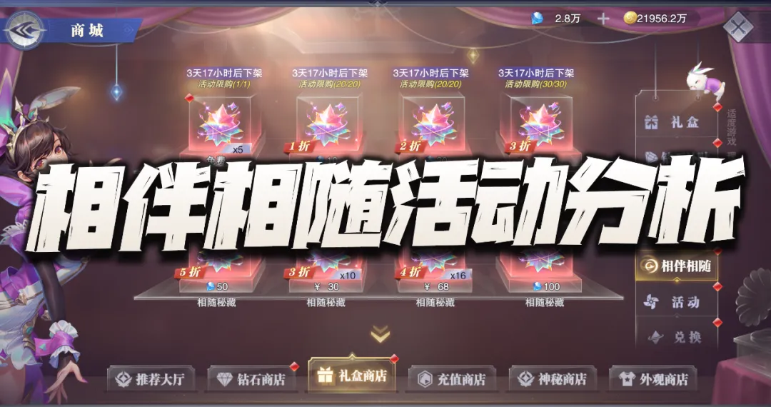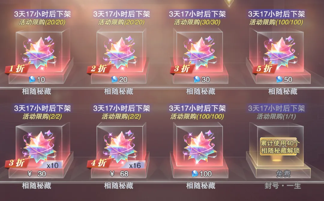 免费赠送5抽 10钻石/抽,限购20抽,相当于此部分最多消耗200钻石获得10抽 20钻石/抽,限购20抽,相当于此部分最多消耗400钻石获得20抽 30钻石/抽,限购30抽,相当于此部分最多消耗900钻石获得30抽 50钻石/抽,限购100抽,相当于此部分最多消耗5000钻石获得100抽 100钻石/抽,限购100抽,相当于此部分最多消耗10000钻石获得100抽 RMB礼包购买(初始只能看到30元和68元礼包,后续还能逐步解锁......)