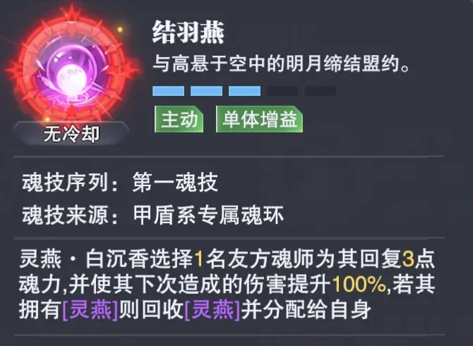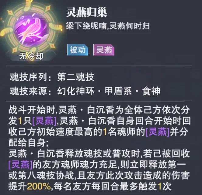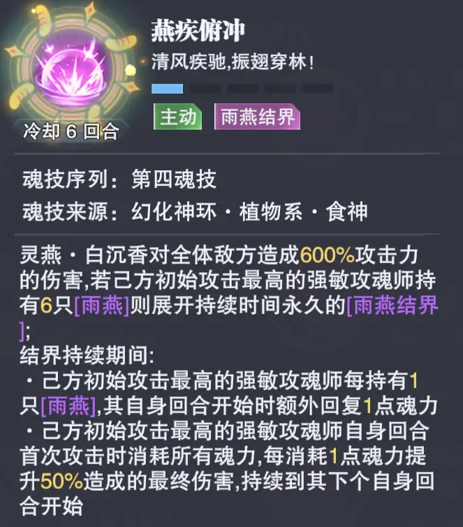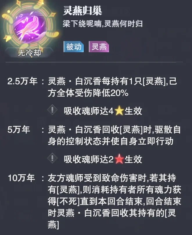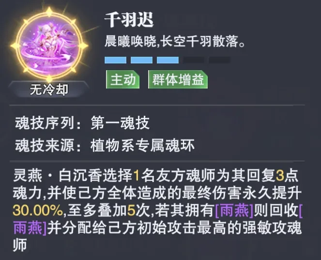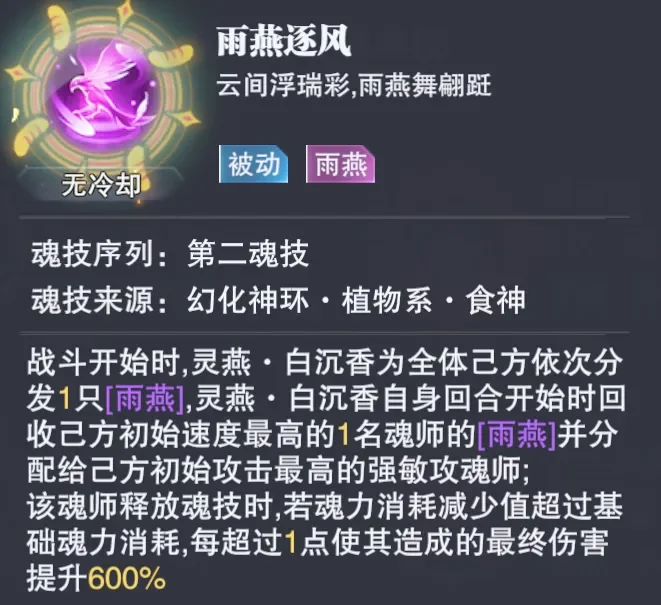 然后2-1被动则是大白PVE中的核心机制,其提供了大白不断回收每位魂师身上的雨燕后转而分配给初始攻击最高的强敏攻系魂师的作用,目前我们的主C最高可以带6只雨燕,而在集齐了6只雨燕后,主C的输出也会有更强的增伤表现。