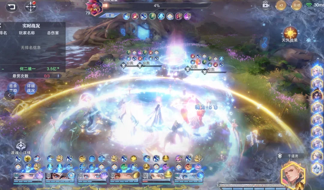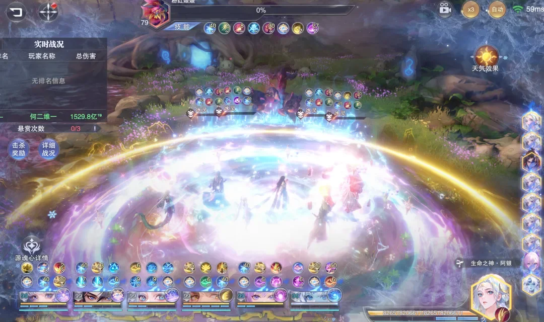 接着简单说下测试环境,这个号等级99级,战力700亿-800亿之间,打的boss为世界悬赏的5桩敏攻系boss,天气为烈日,用SP冰帝当做主C来打,两组实验只分别替换SP奥斯卡和SP白沉香,其它角色的手法操作基本保持一致,然后整个阵容都是同时激活了5条鱼+6神佑(SP宁荣荣源魂心)+7情绪神位的,其中SP小白暴击属性或速度不够的话可关闭部分魂师的8、9环属性即可。