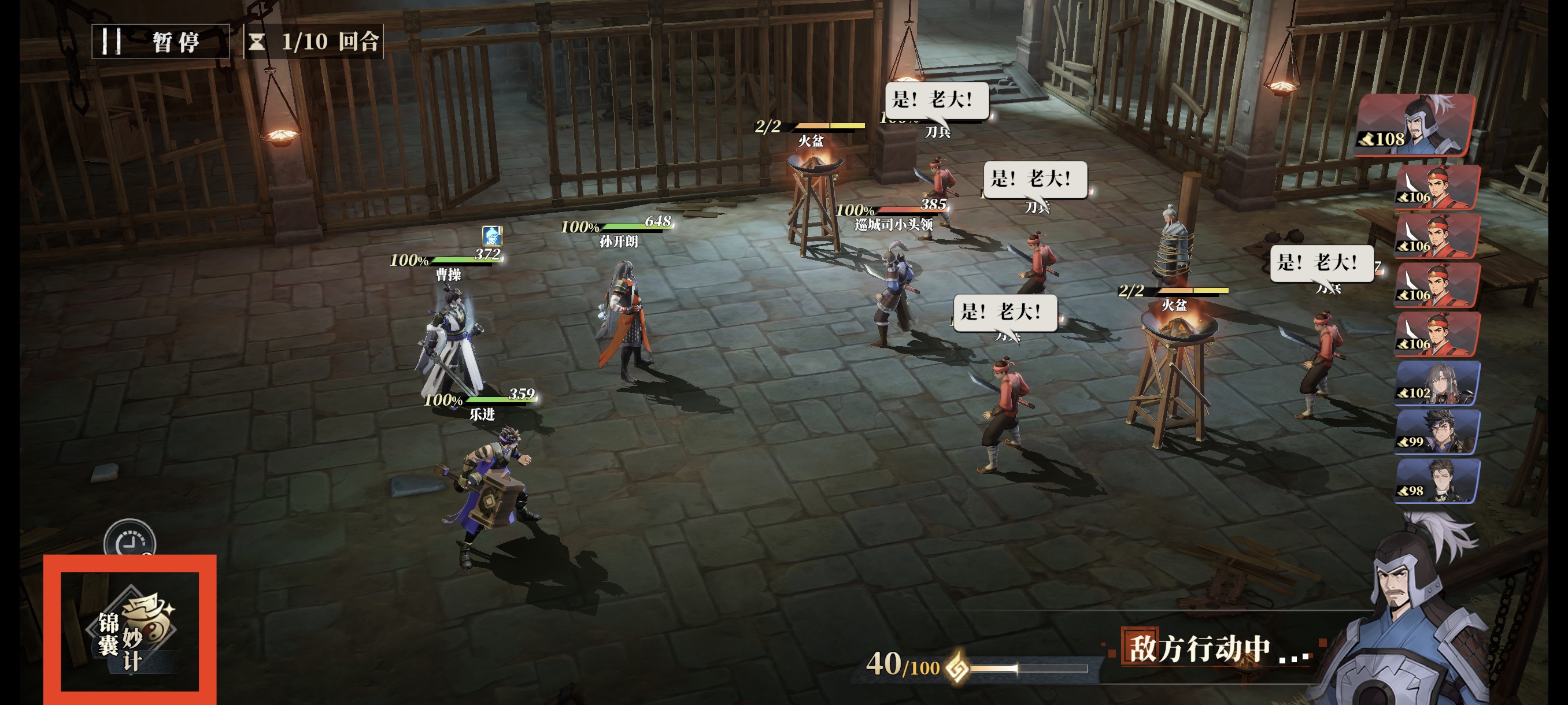 3、第2回合开始,敌方县吏和同监会轮流蓄力放大招,甘宁必须一直放大招打断,哪里亮了点哪里。