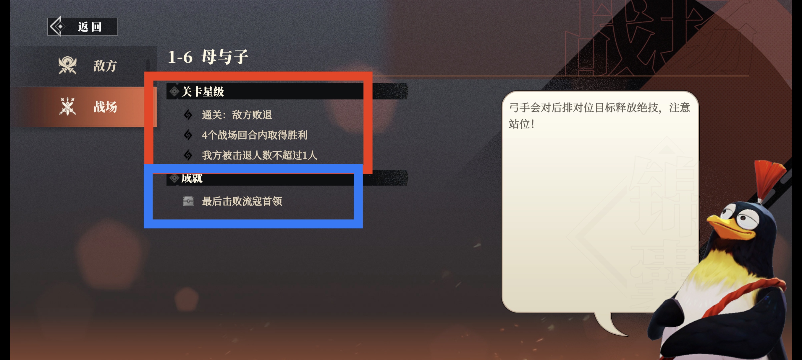 点击战斗界面中的【锦囊妙计】,可以查看本场战斗的满星条件(红框部分),只有全部达成才能满星通关。而蓝框部分是额外的成就任务,不影响正常通关,但如果达成条件,即可获得额外的成就奖励。(一般为三山壁)