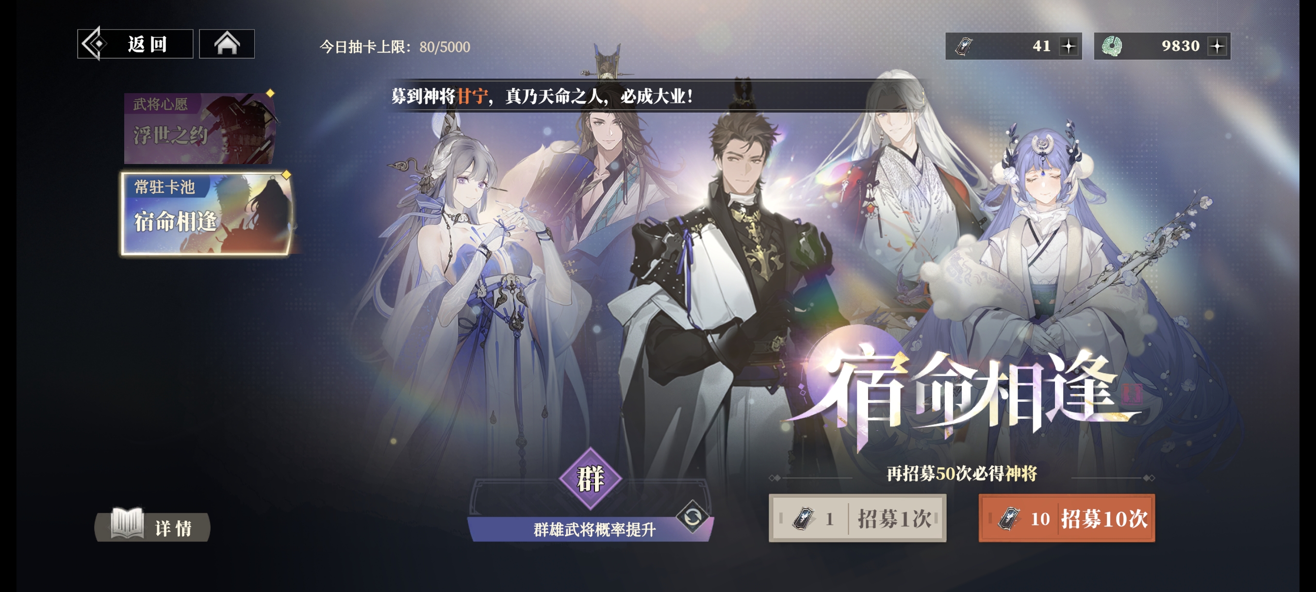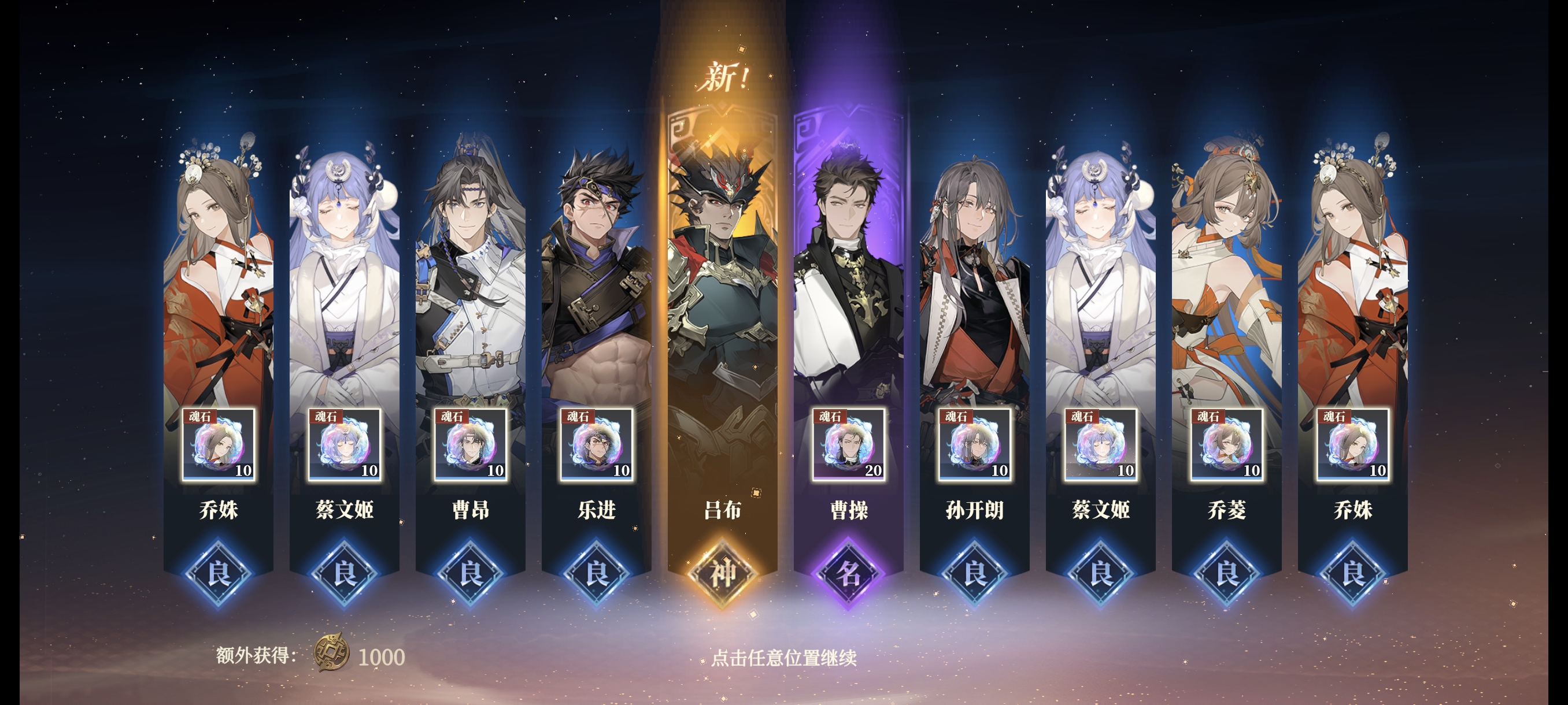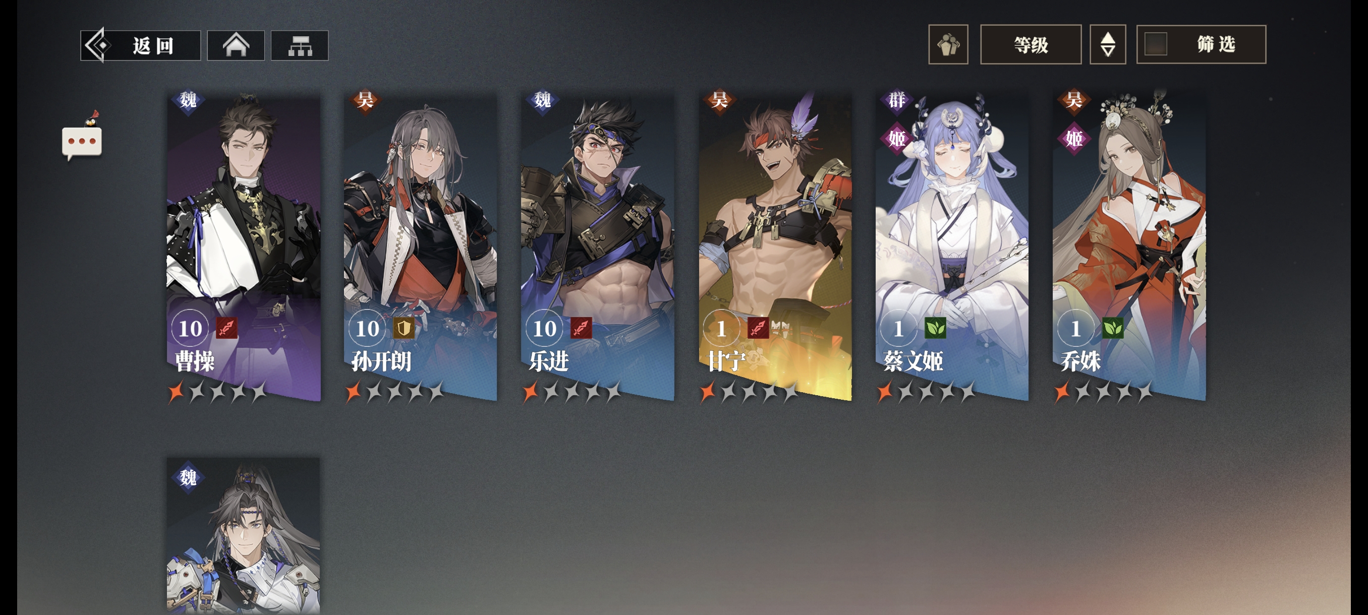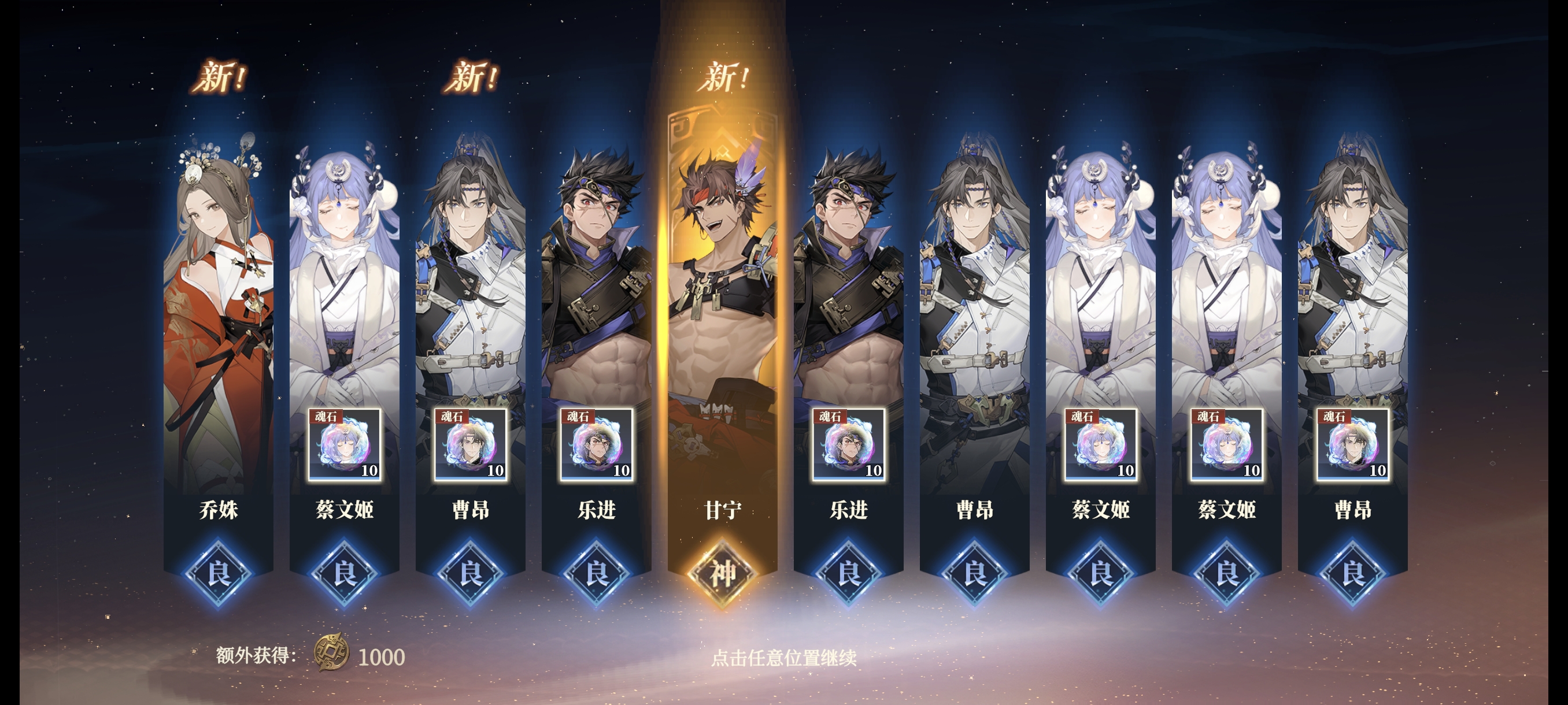 首次十连抽必得神将-甘宁,加上第一章剧情送的肉盾-孙开朗、输出-曹操和乐进、奶妈-大乔和蔡文姬、辅助曹昂组成了我们的初始新手阵容。