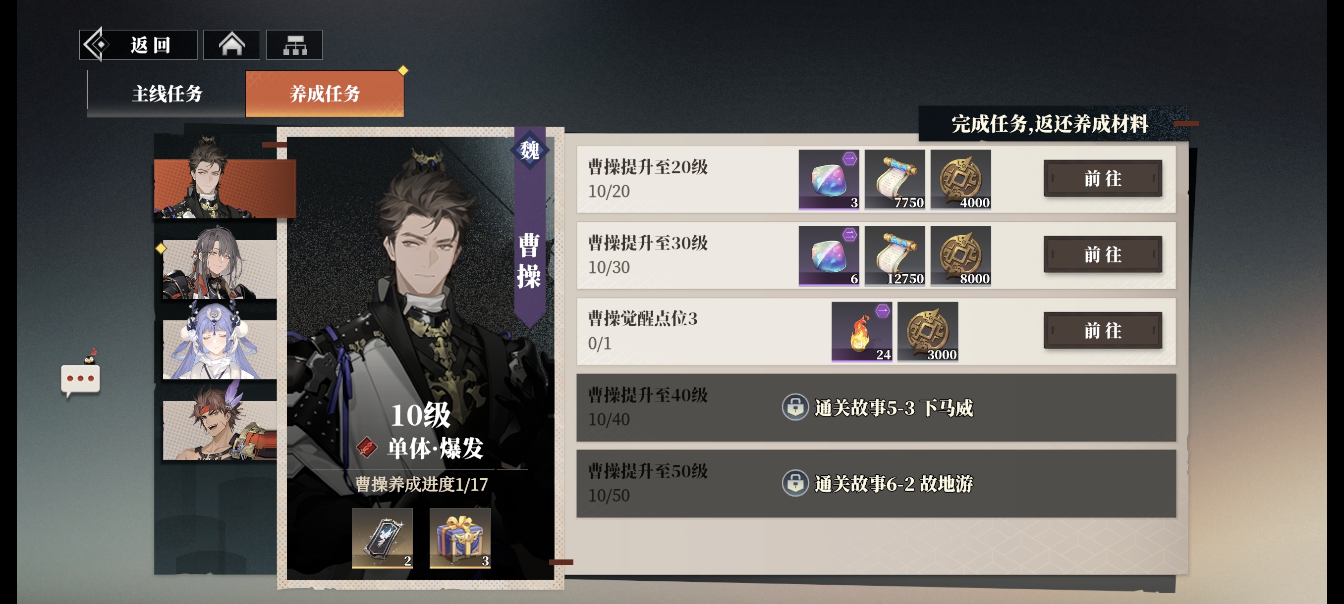 初始阵容中的曹操、孙开朗、蔡文姬、甘宁4人分别有个人养成任务,完成任务可获得大量经验、铜币、进阶材料、好感礼物等养成资源,全部完成还可获得共9张抽卡券。