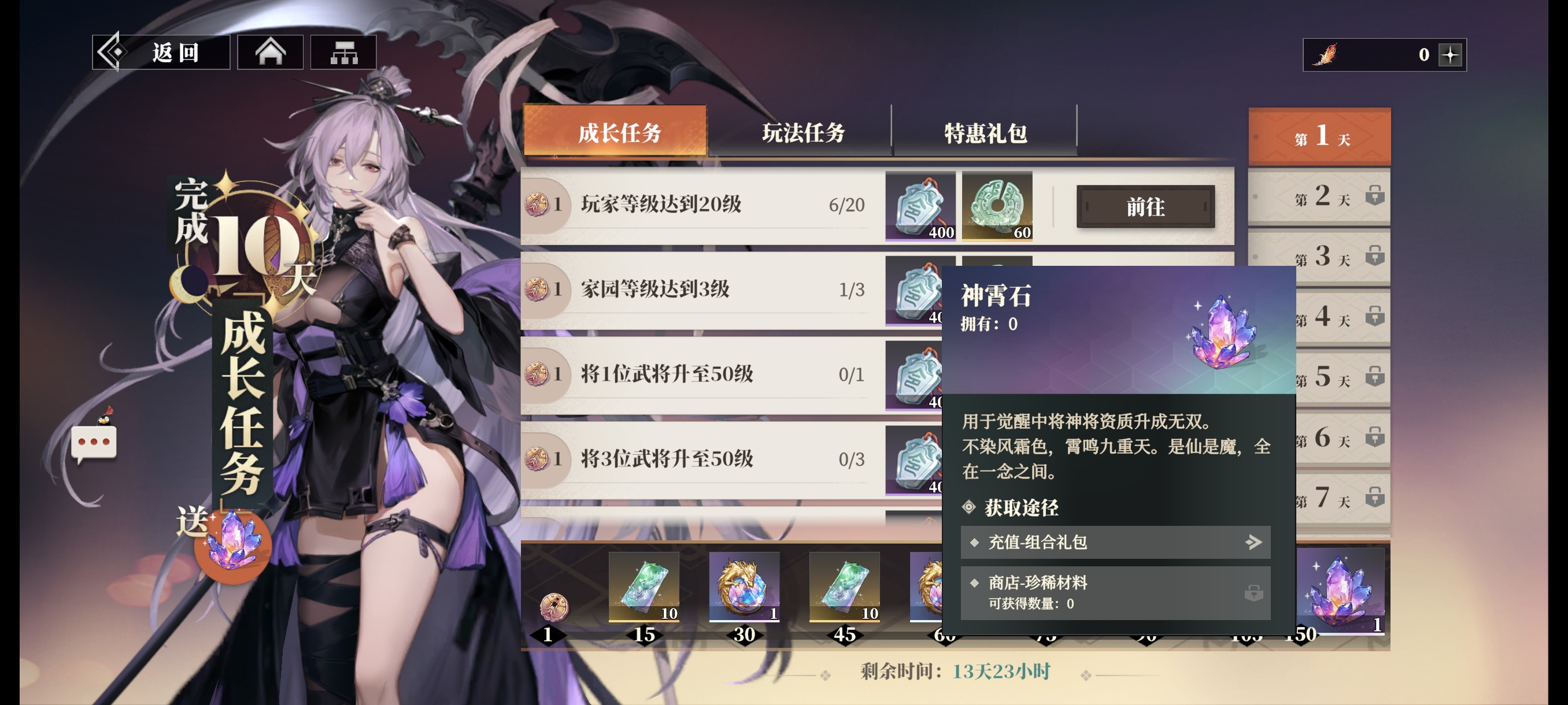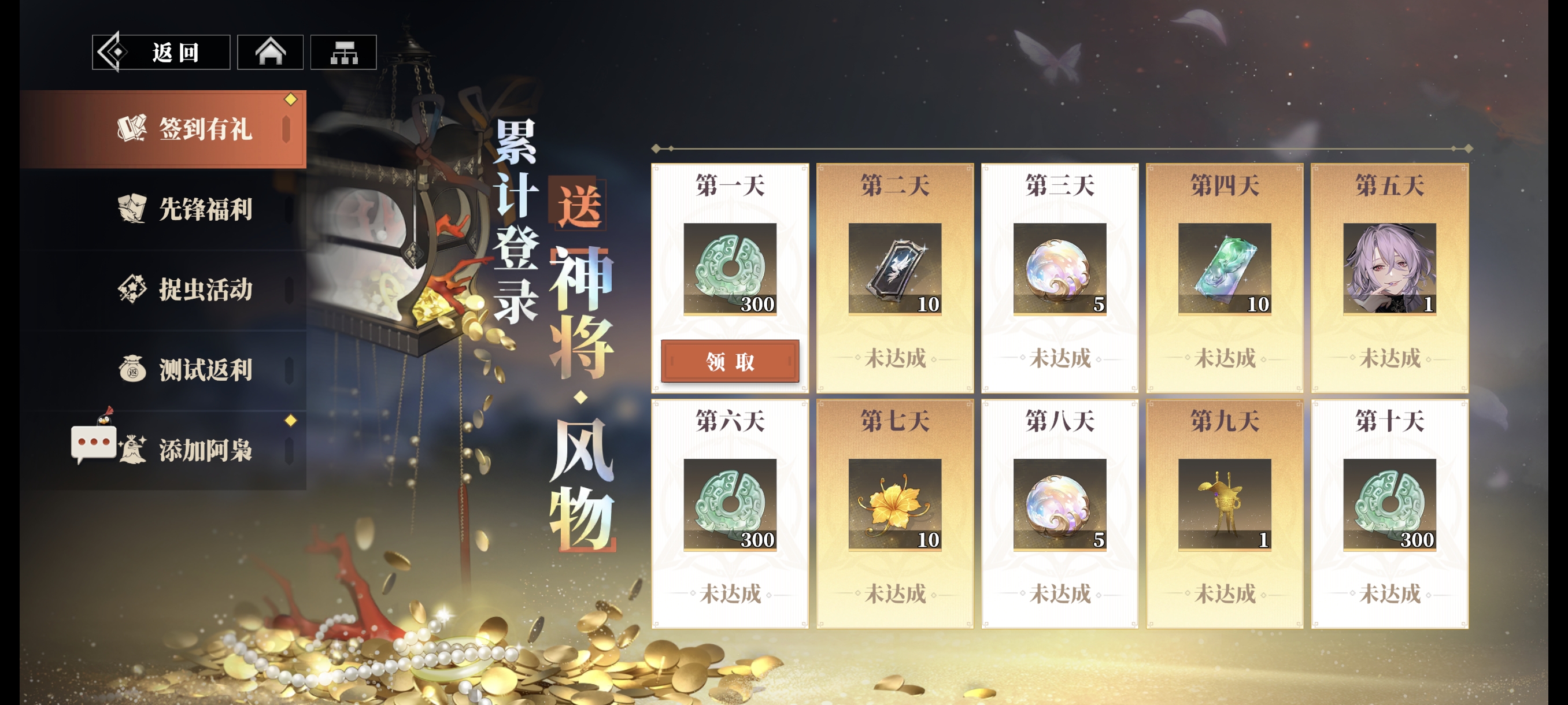 解锁十日活动,每天完成日常任务,即可获得50个七杀符(此后简称心愿抽与普抽区分)+神霄石(神将升无双必要材料)+大量三山壁和其他资源。