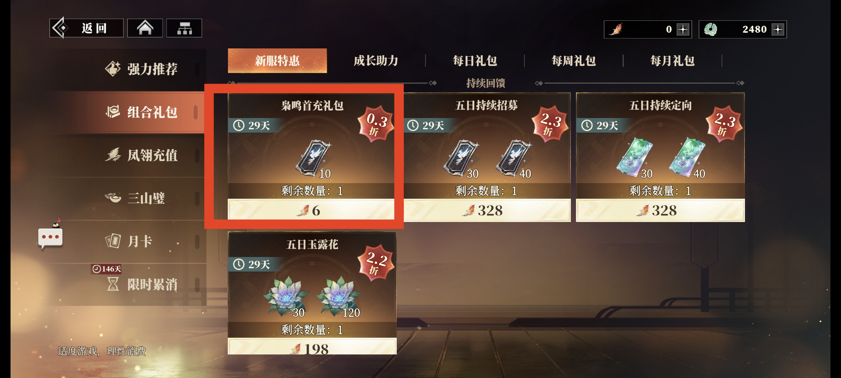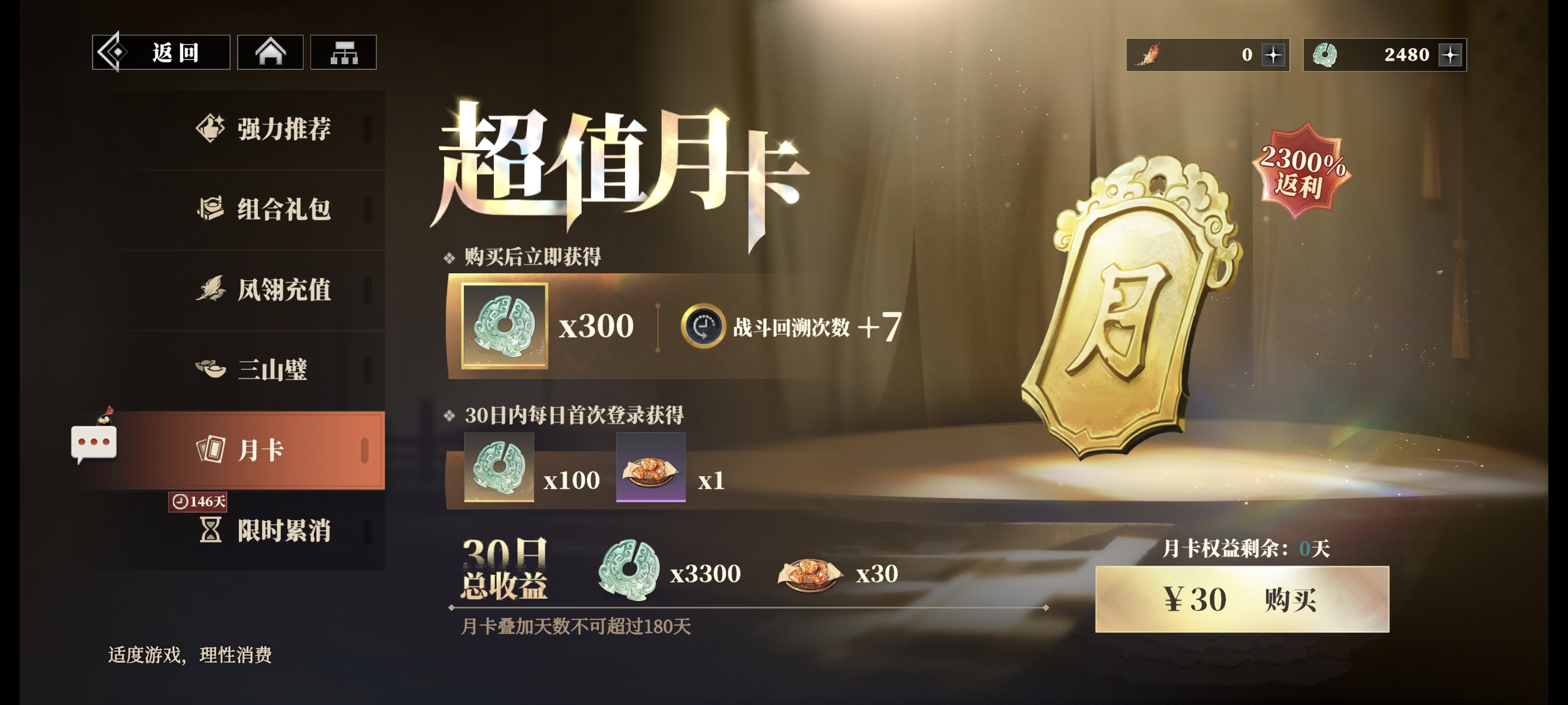 购买本游戏性价比最高的三种氪金消费,分别是首充礼包、月卡、功勋玉简,共计6+30+98=134块。