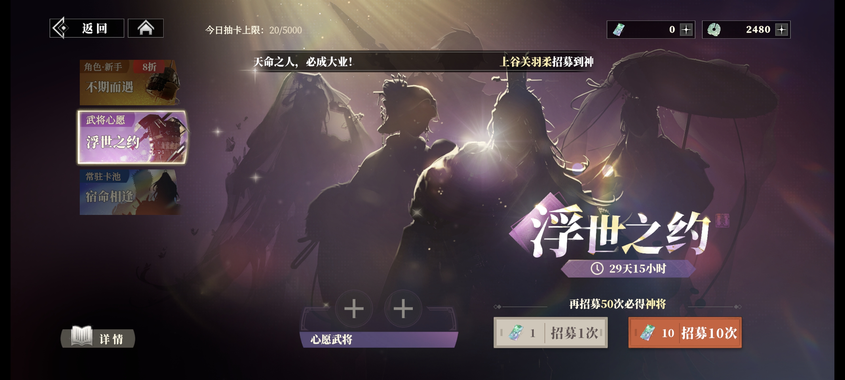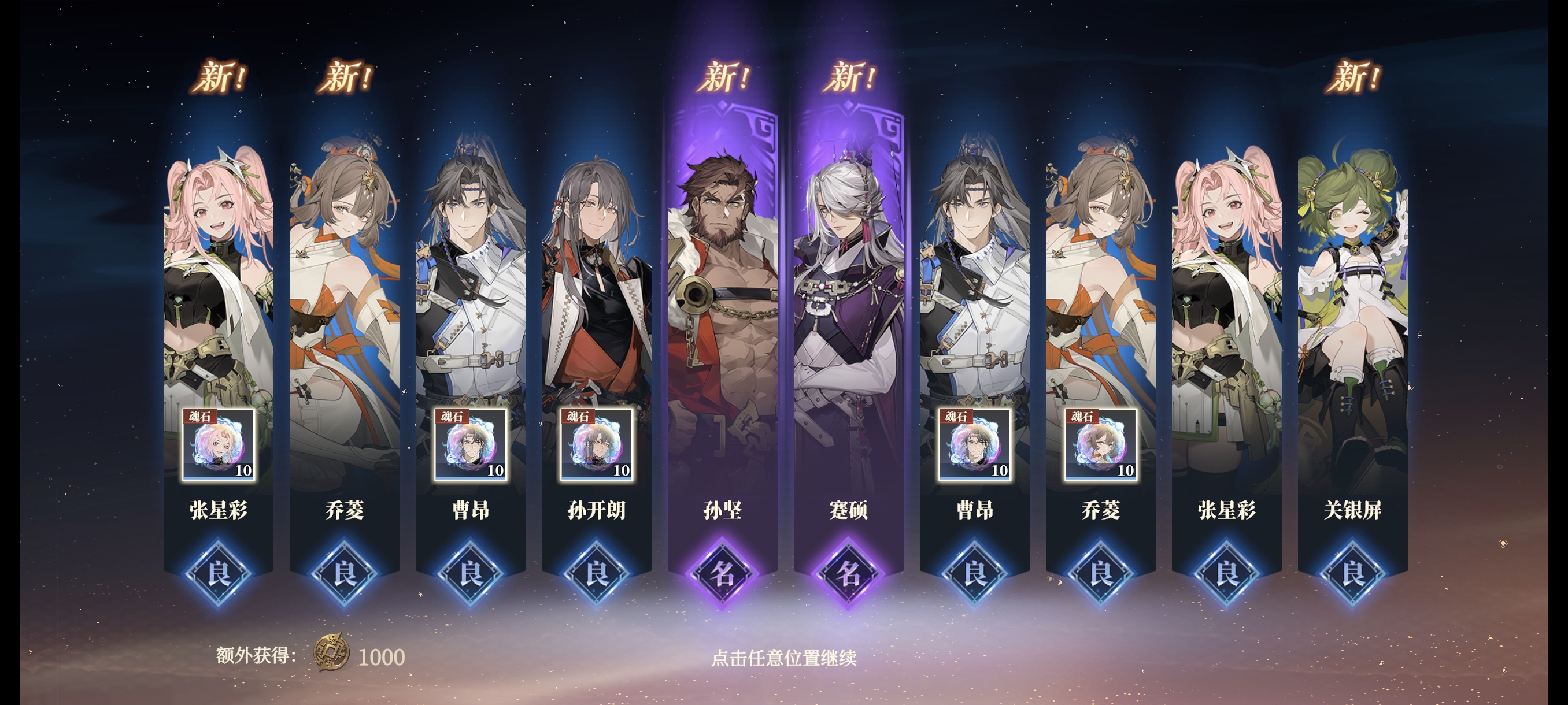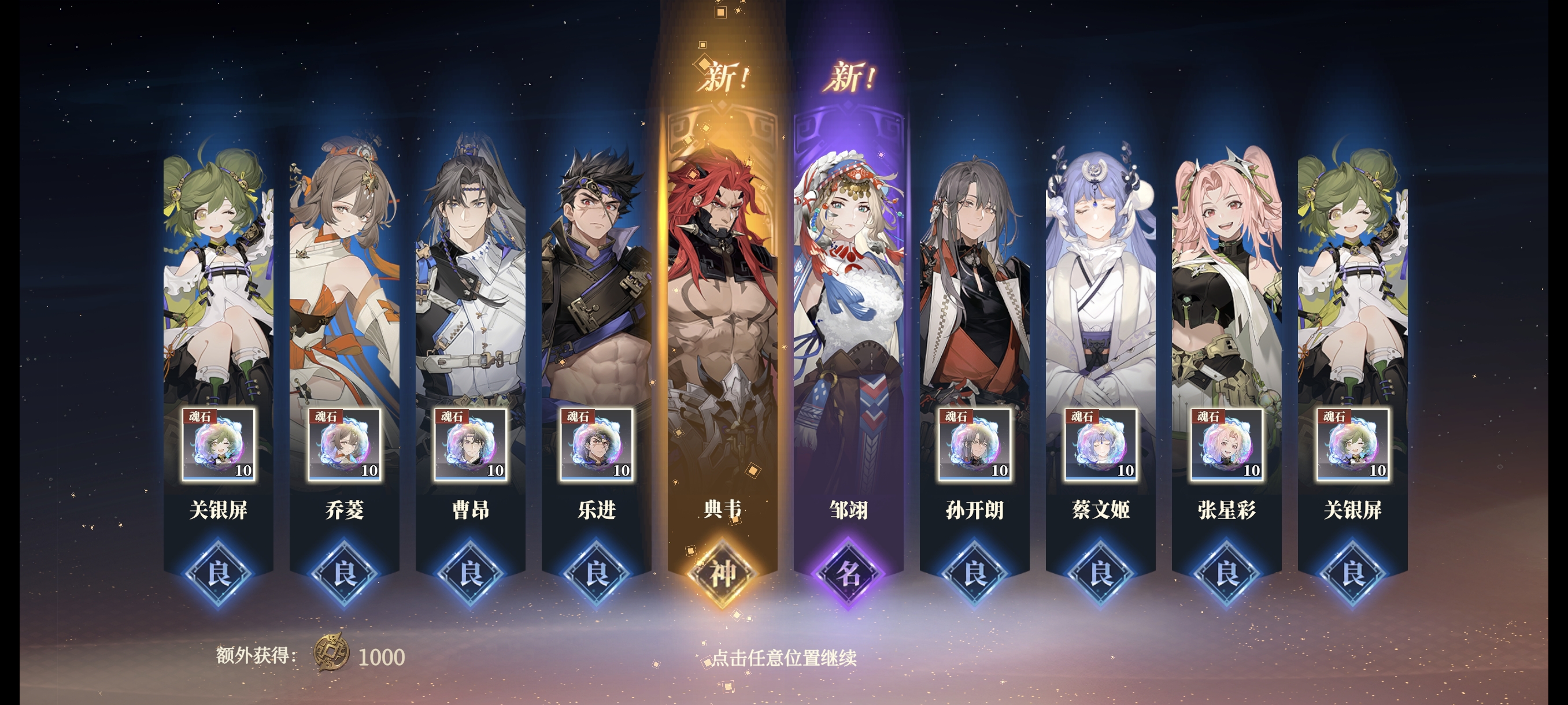 清完所有日常任务和开服活动任务,凑齐今天的第5-8次十连抽(8折),获得新手池的第2个神将,新手池就此关闭。