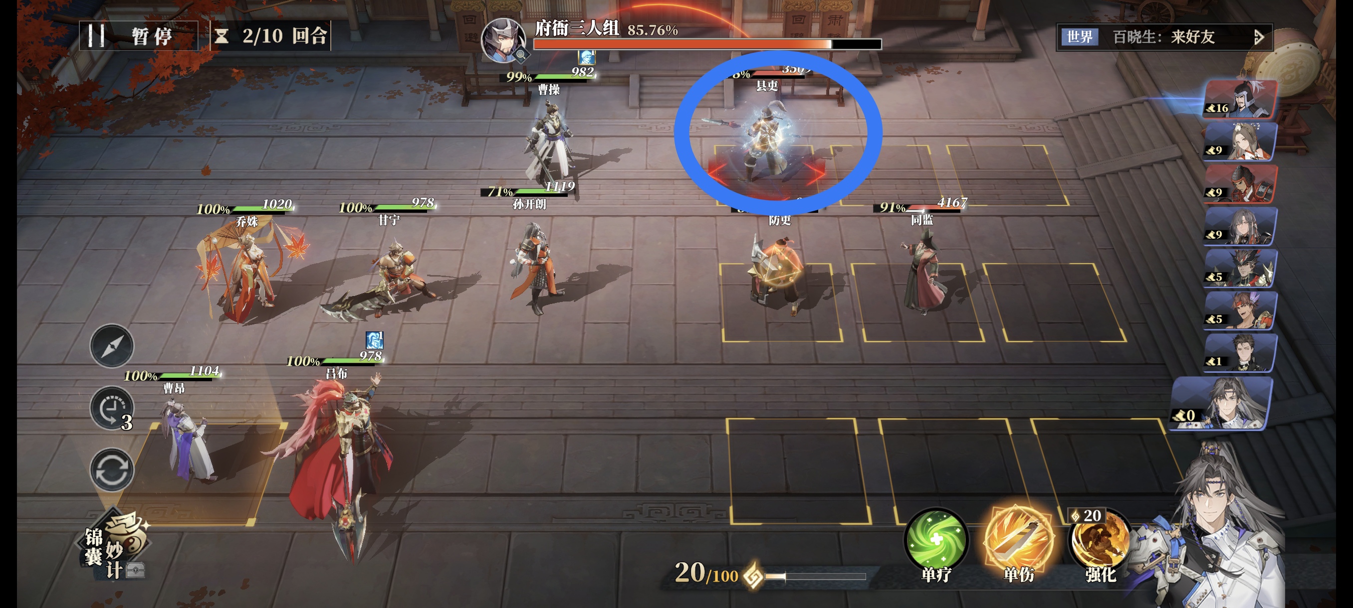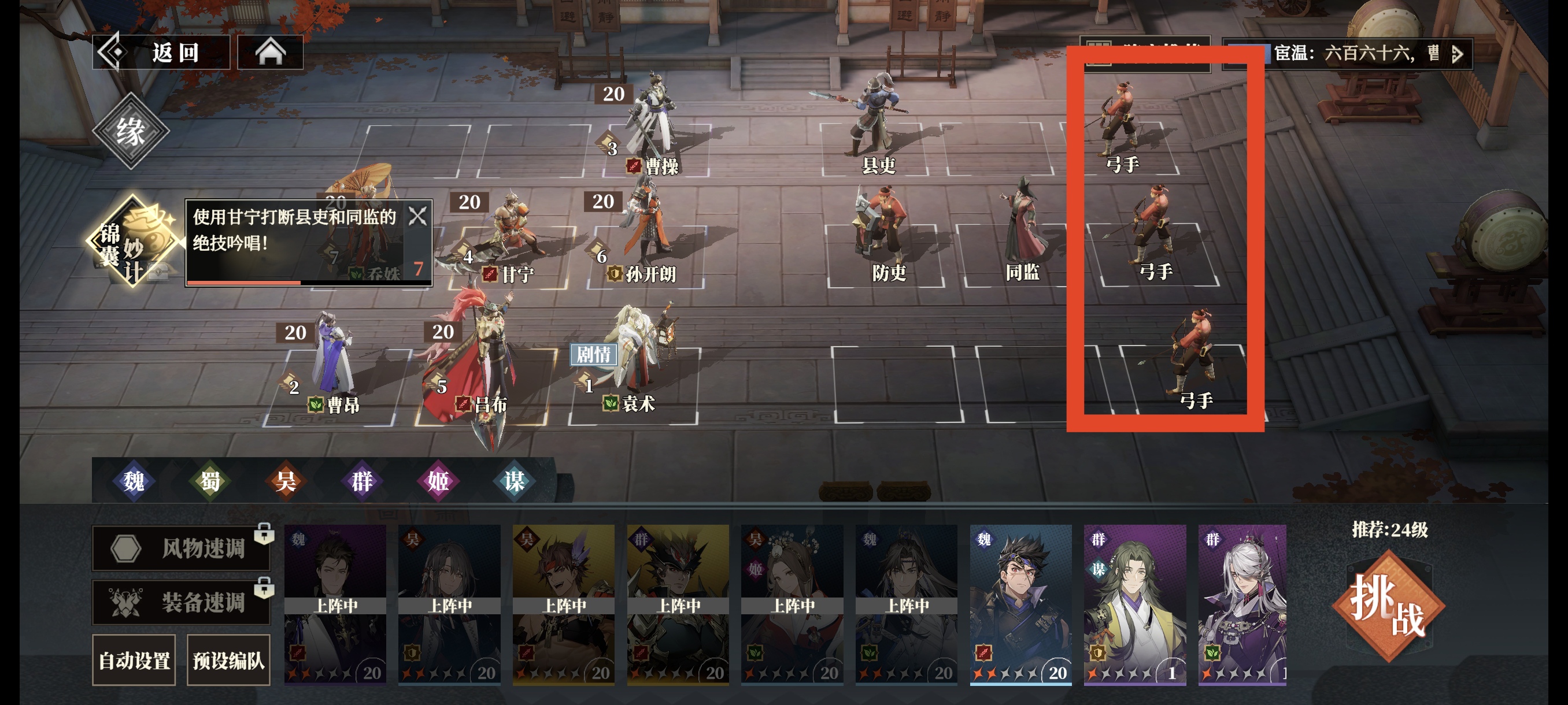 2、首回合敌方不会蓄力,趁此机会让打不到后排的曹昂、曹操普攻攒怒,甘宁+吕布双大招切后排,秒掉所有弓箭手。(如有没秒掉的可用孙开朗大招补刀)