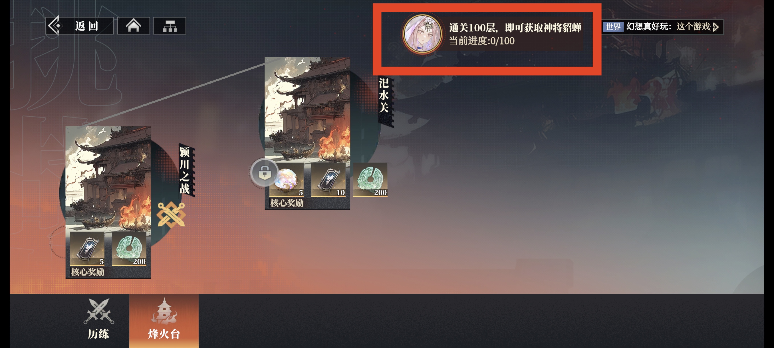 爬塔可获得大量抽卡券和三山壁,通关100层还能免费获得神将-貂蝉!