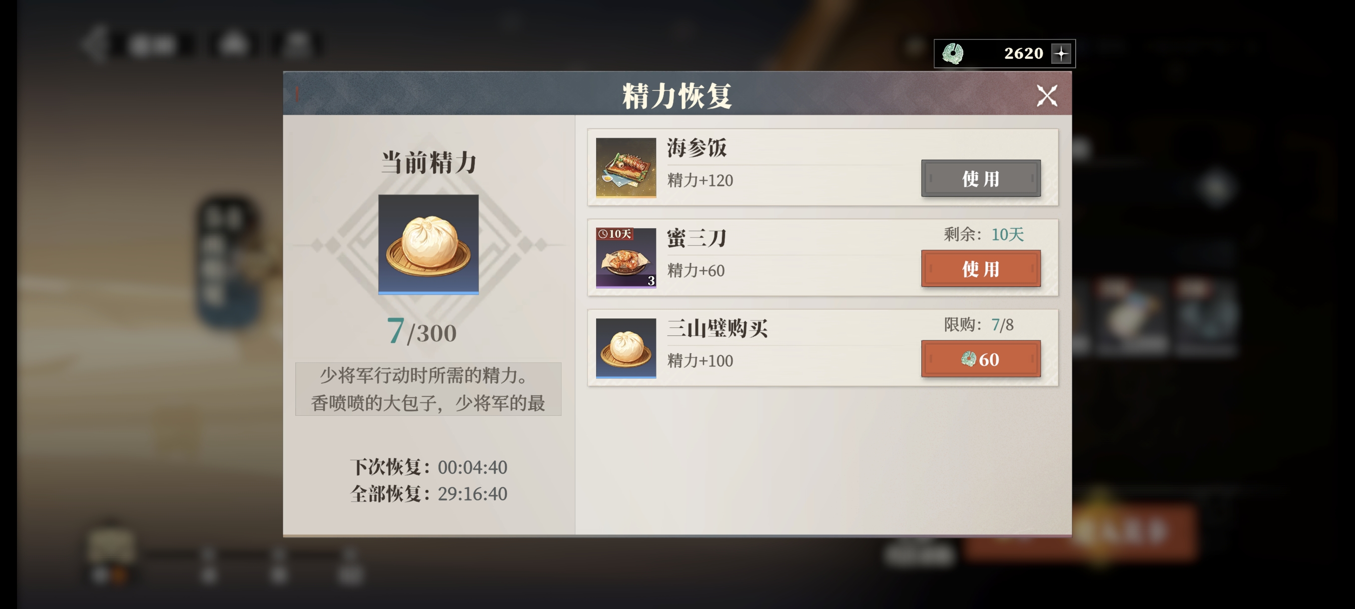 继续推进主线第五章,没体力时优先购买当天限购的包子,前期等级第一,一定不能亏经验。