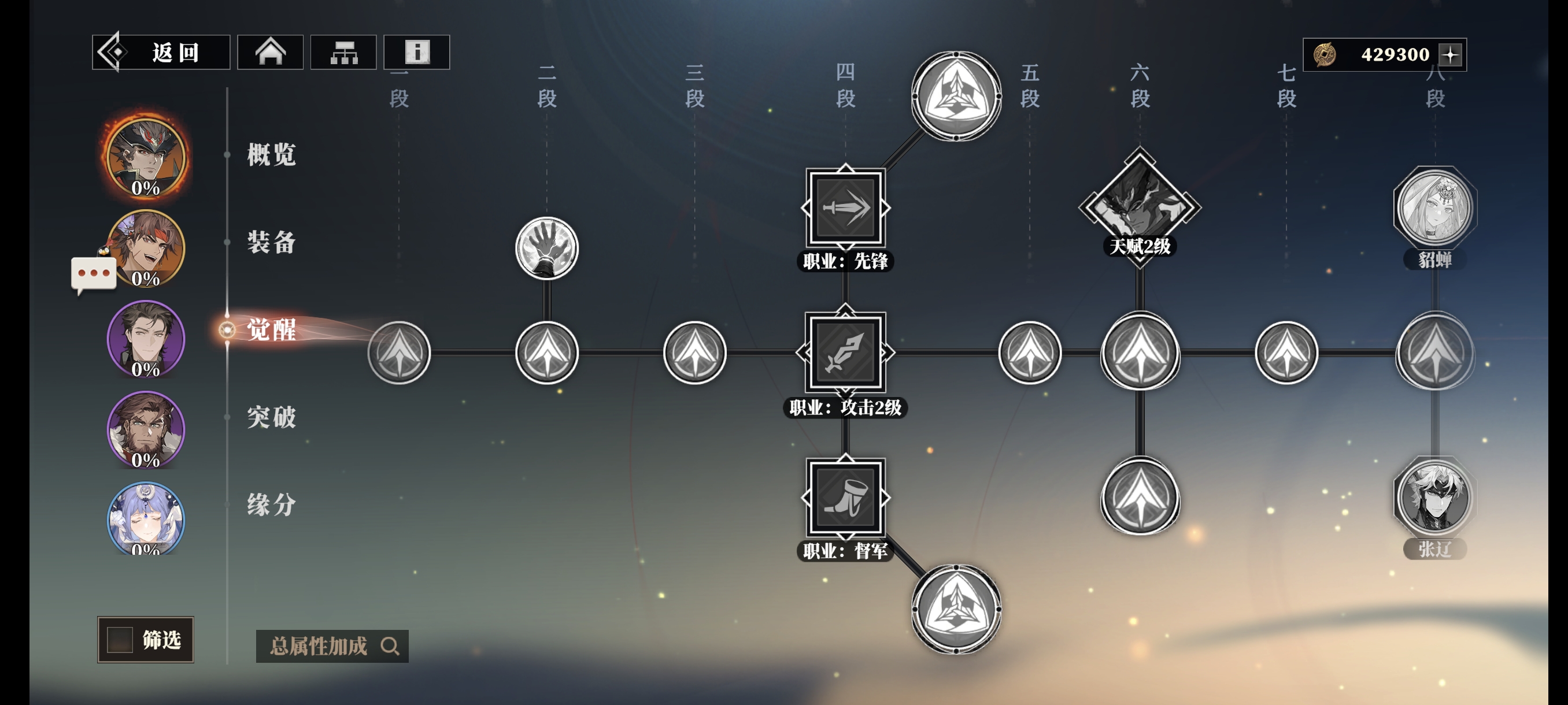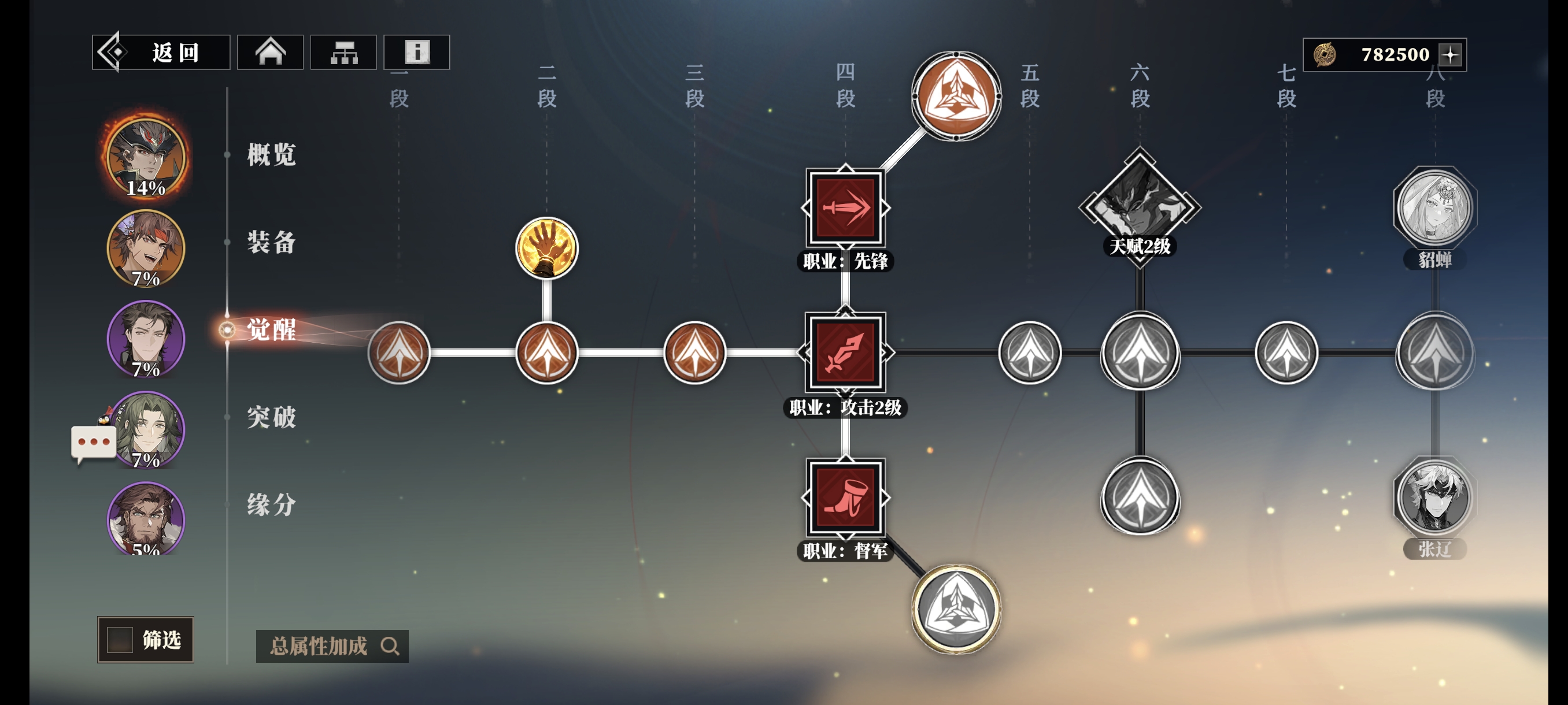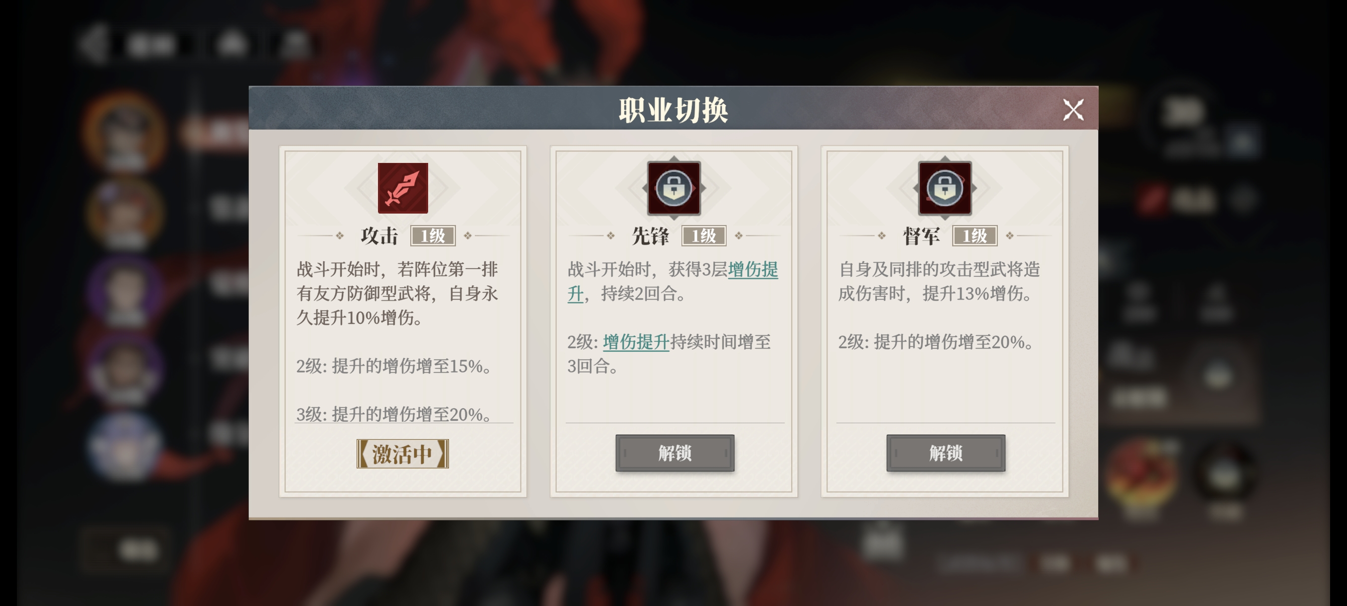 如吕布的初始职业是攻击,可在觉醒4段时进阶为攻击2级,也可以转职成为先锋或督军。