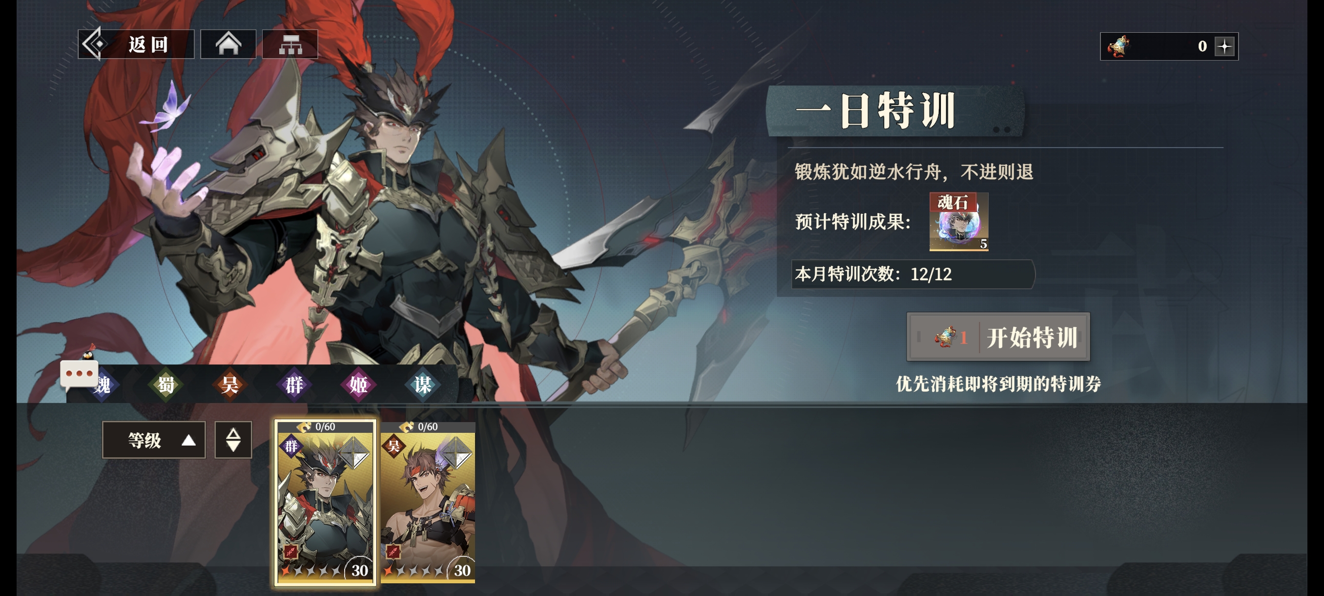 比较重要的是家园中的武将特训每天可以产出5片自选神将碎片!切记不要忘了做,每个月可以白嫖3个不同神将,对阵容构建还是非常重要的。