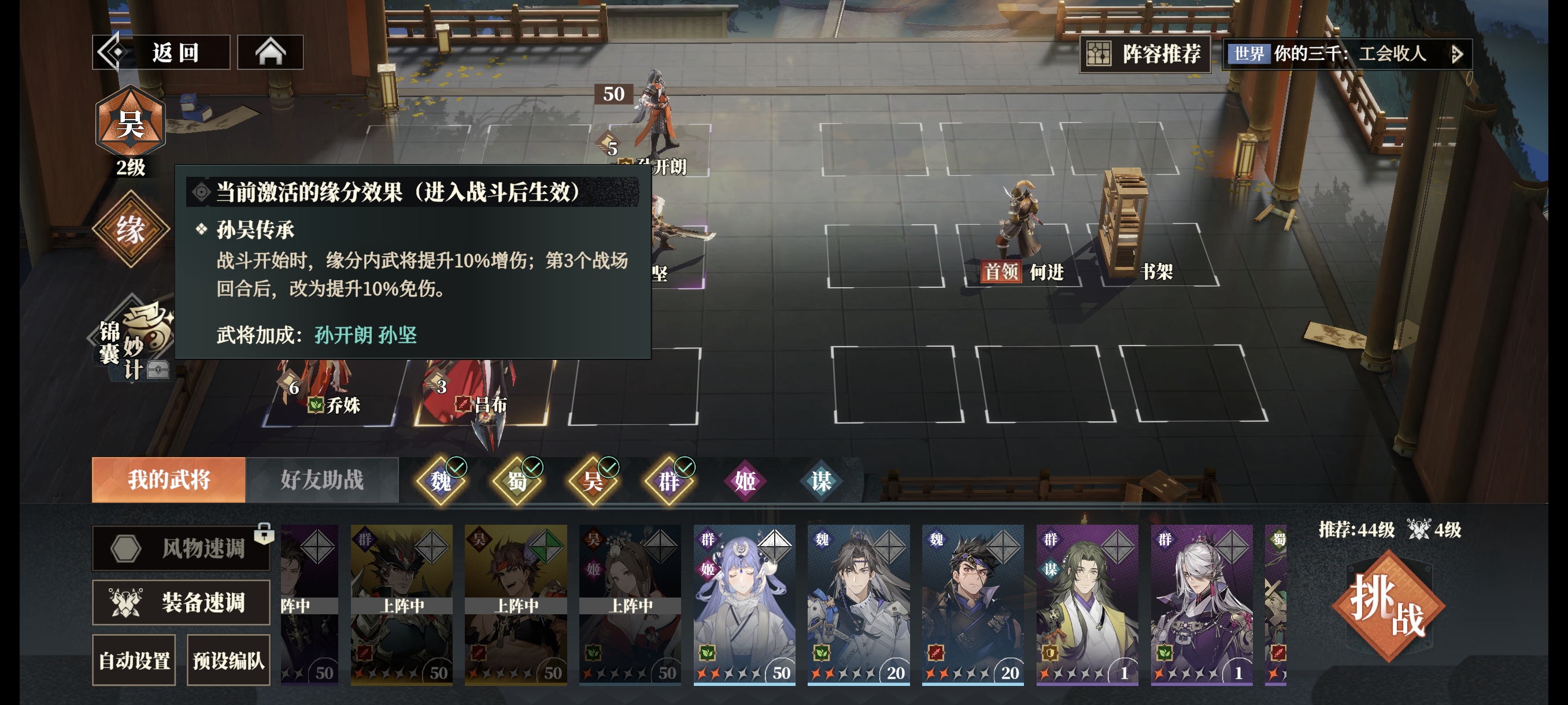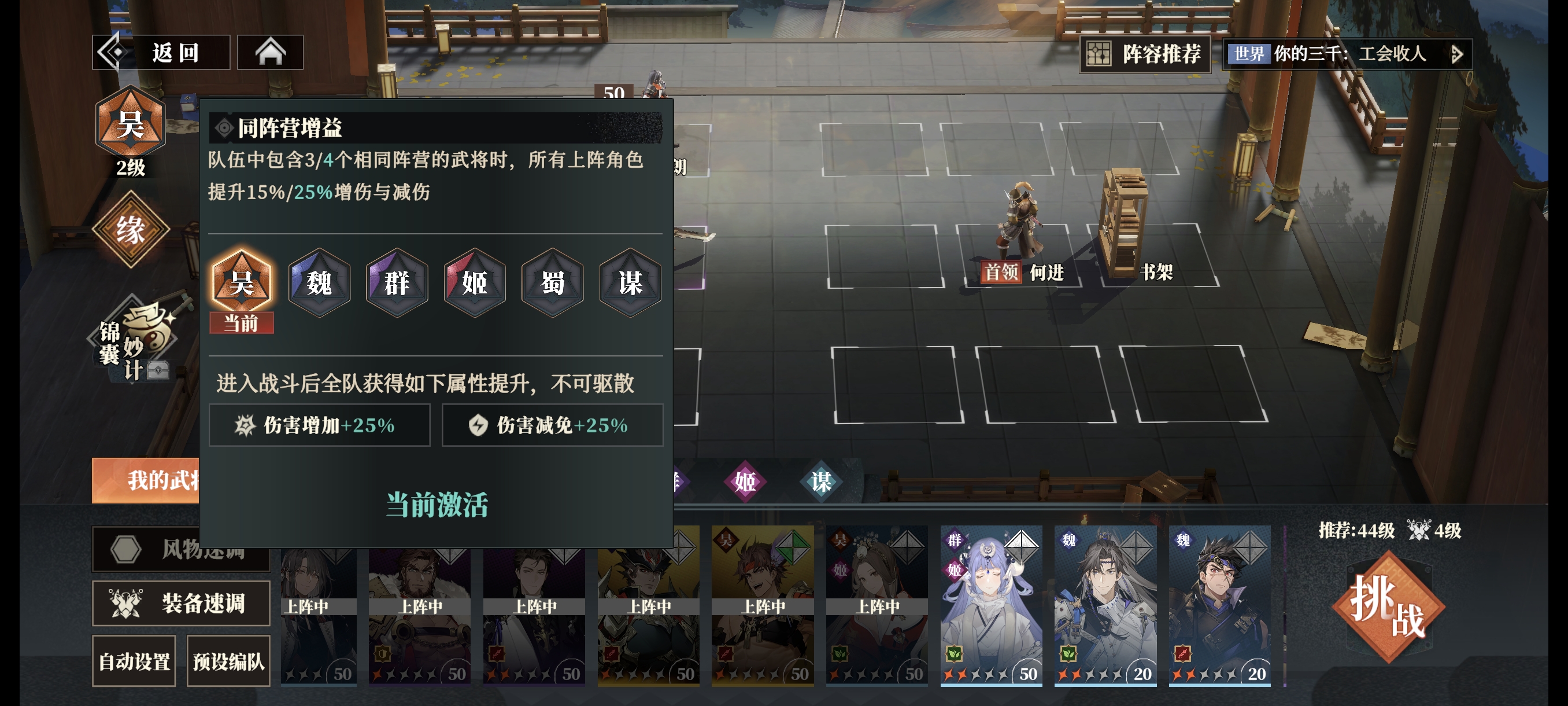 阵营增益系统开启,上阵3/4个同阵营武将时,全体+15%/25%增减伤,这个加成是非常大的,是我们构建阵容的核心方向之一!