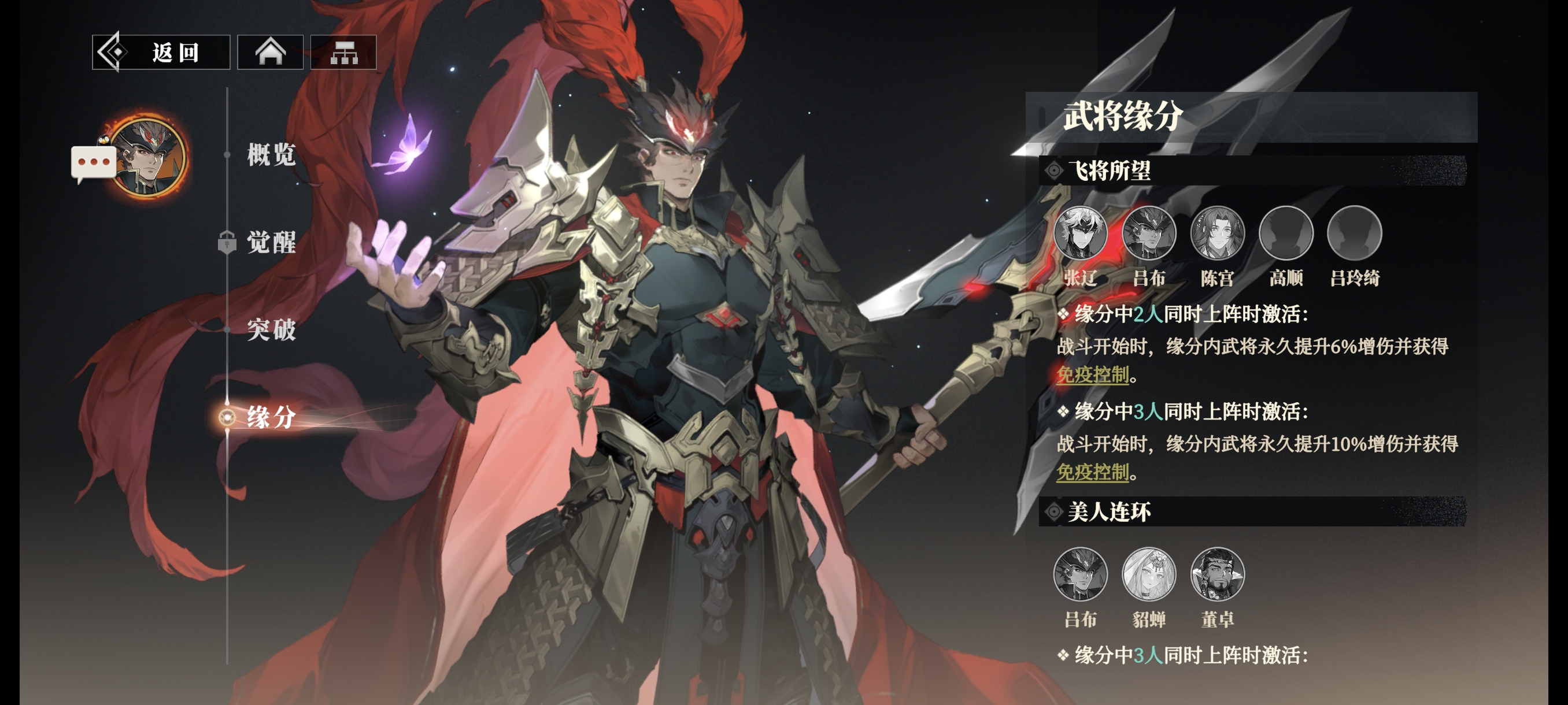 *例如吕布张辽的缘分能获得【免疫控制】,关羽赵云的缘分能获得【无视护盾】,都是比单纯加属性更重要的机制。