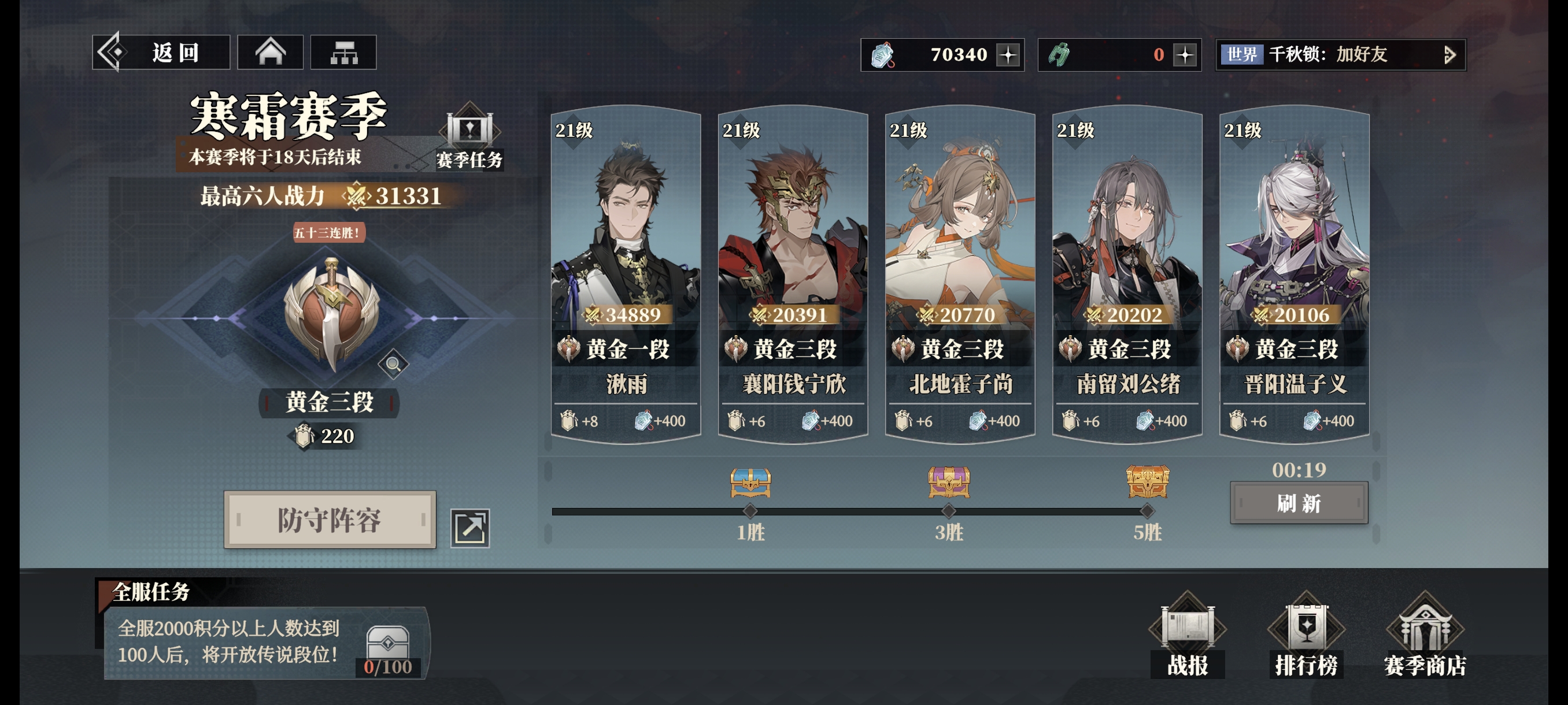 所有日常全部清完,把战力拉到当前极限,然后开刷竞技场,万万没想到,第一天最花时间的竟然在最后,花了1个多小时,狂刷53连胜,达到黄金3。