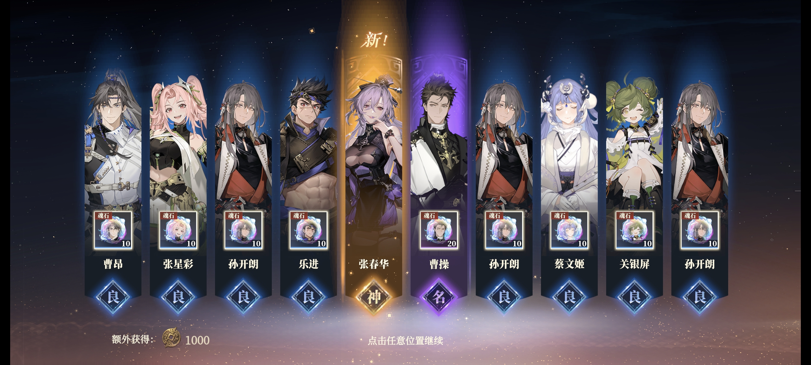 把前面领到的所有抽卡券凑齐今天的第9-12次十连抽和十连心愿抽,抽到第4个神将-张春华。