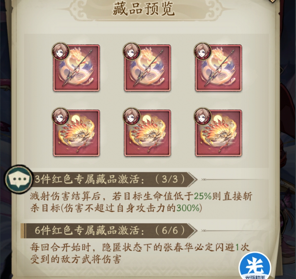 ②藏品6件套:加了春华隐匿状态下必定闪避一次伤害,增加了春华的生存力。