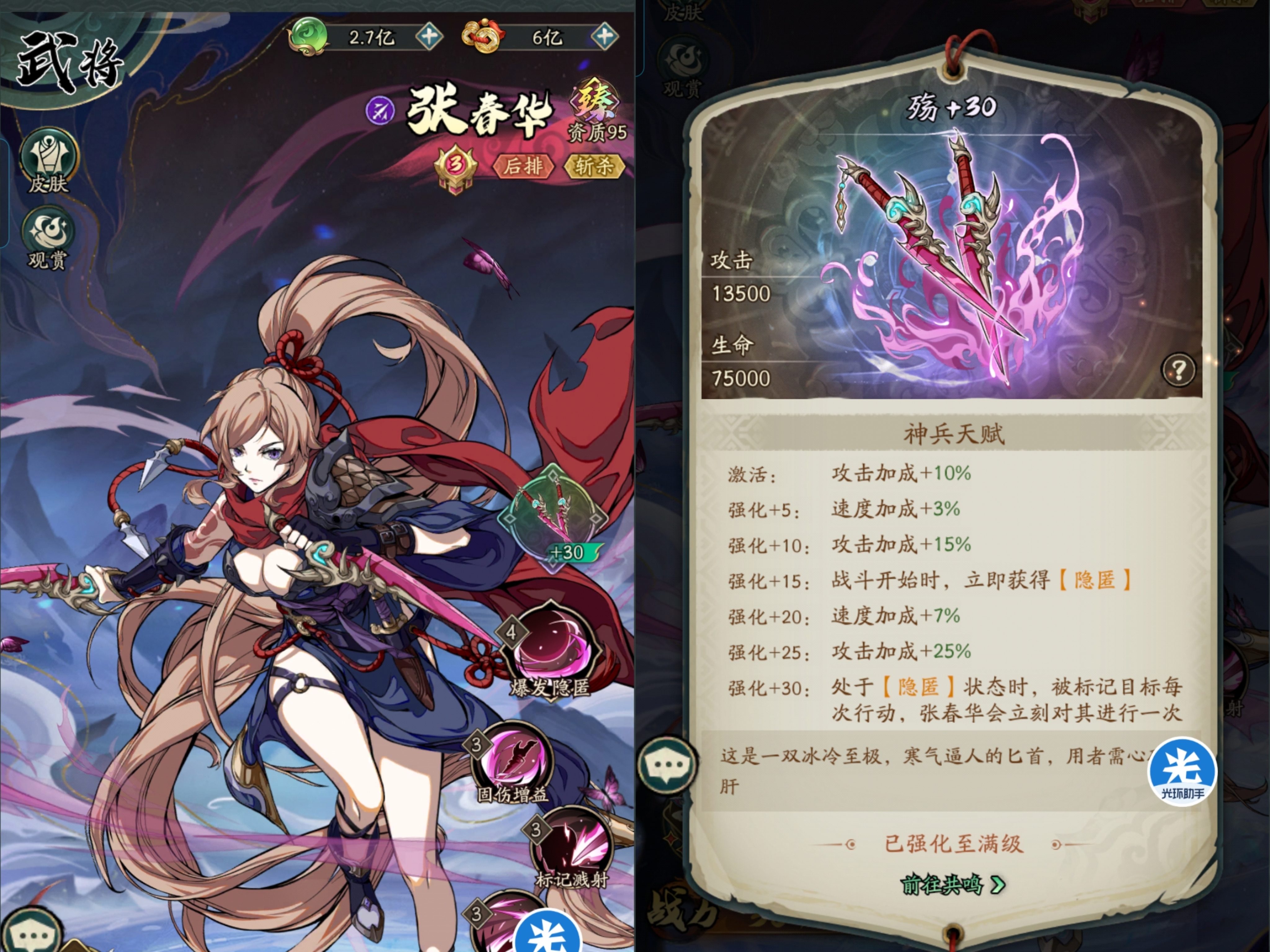 神兵+30是加强队伍的5%伤害和5%命中,最大可以叠加3层,这点也加强了诸葛亮的团队增益效果。