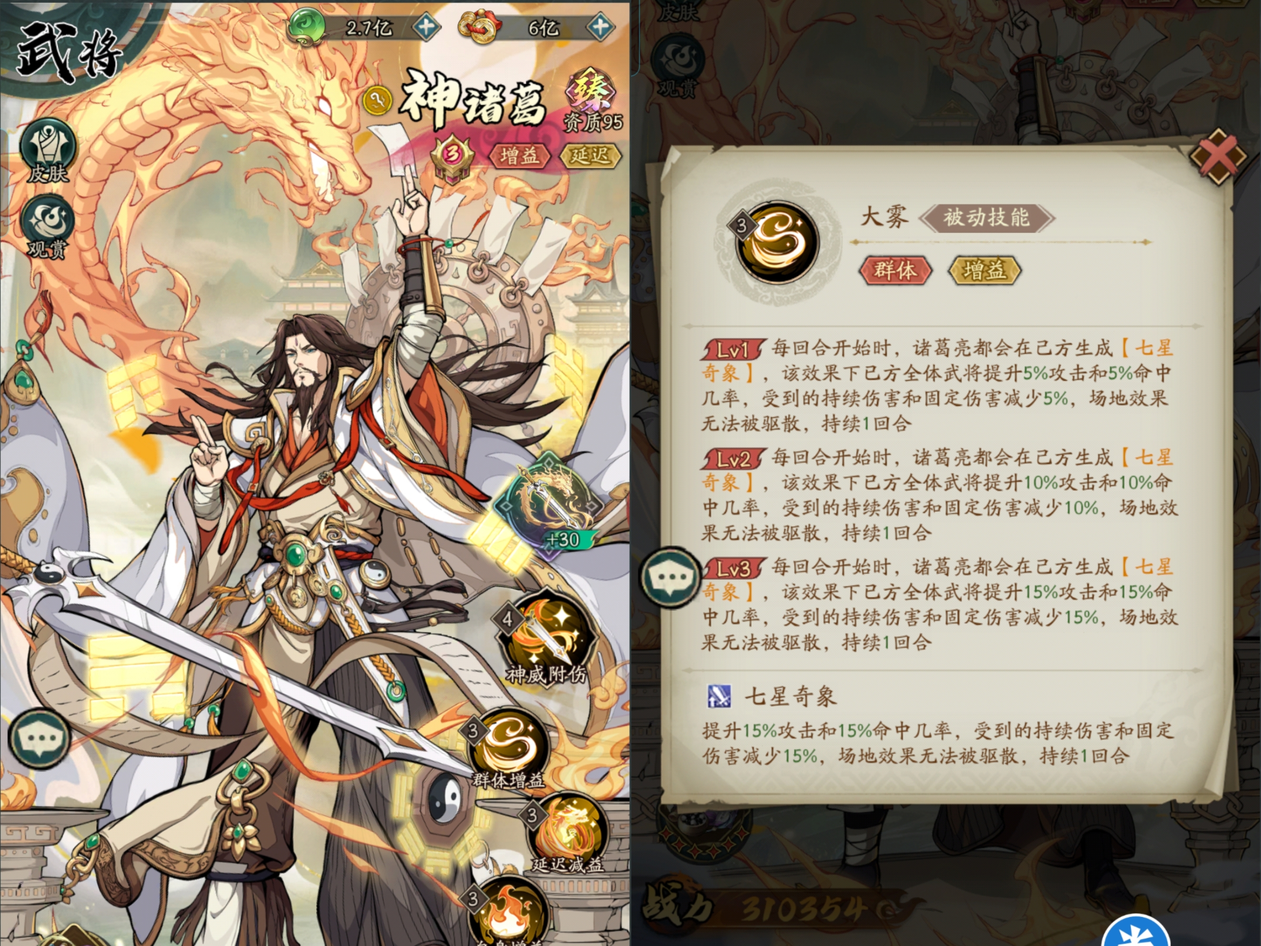 诸葛亮的七星奇象:不在需要以前那样释放技能后开启七星奇象,而是每回合开始时候都可以直接给队伍挂上七星奇象,直接加强队伍的攻击和免伤,这点改版是非常好的!