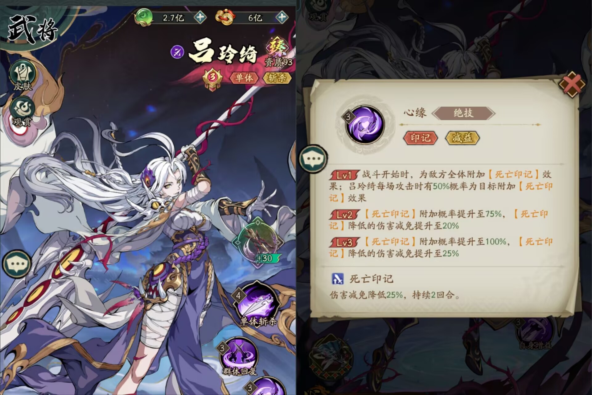 现在改为被吕玲绮挂上携带【死亡印记】目标死亡以后,会为全体队友回复吕玲绮的200%攻击力的生命,给吕玲绮加强了一些辅助作用。