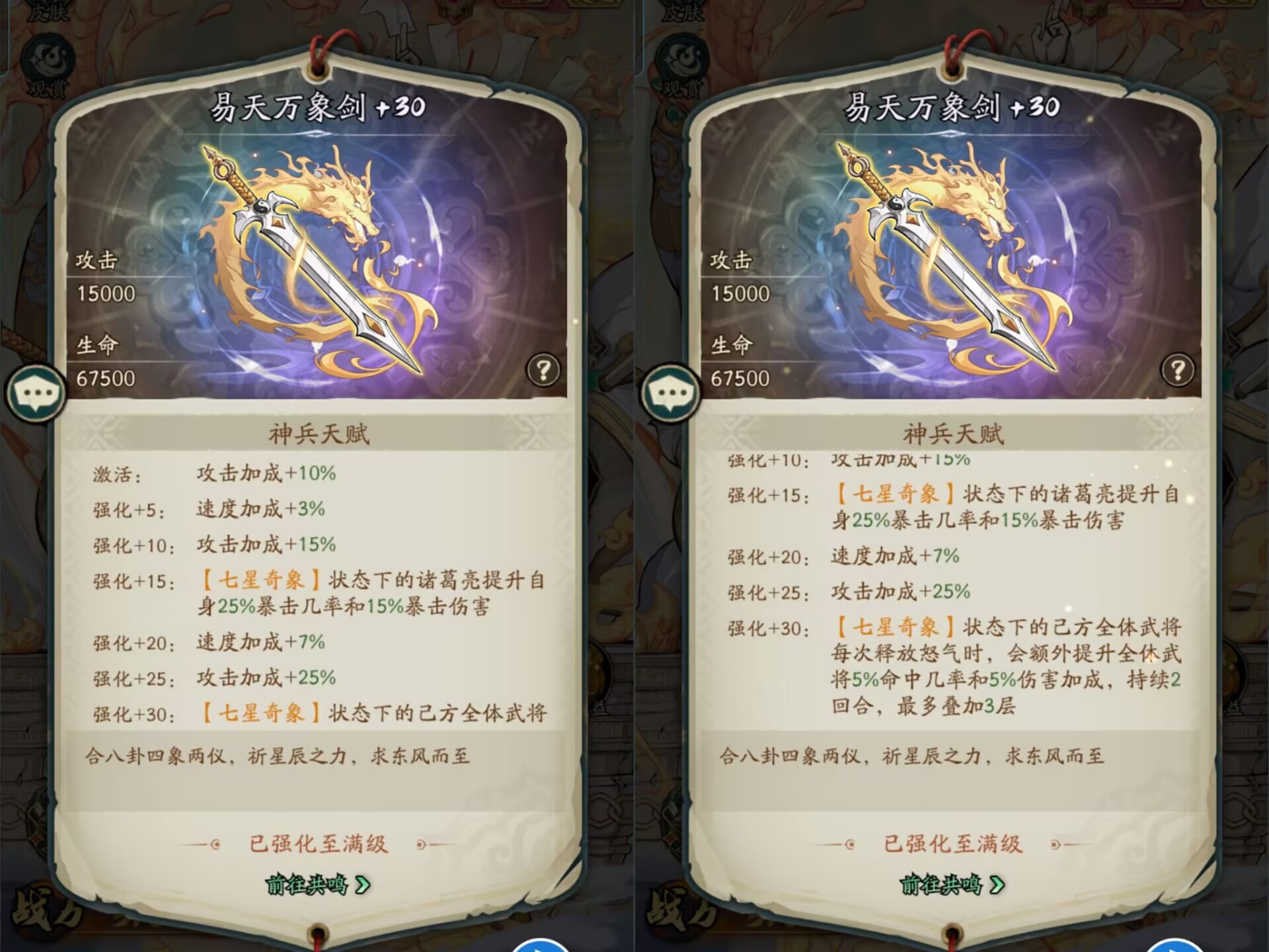 神兵+15【七星奇象】加强了25%暴击和15%爆伤,也就是加强了诸葛亮的输出伤害,以前是没有的。