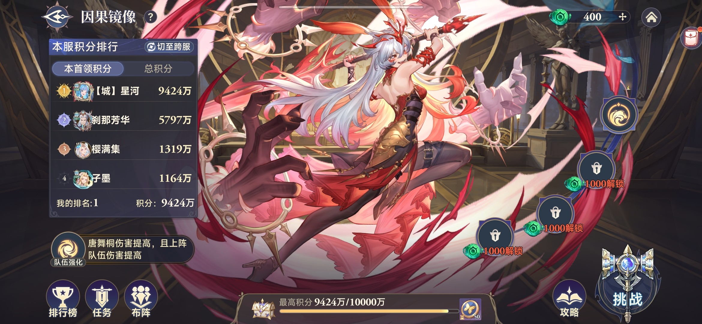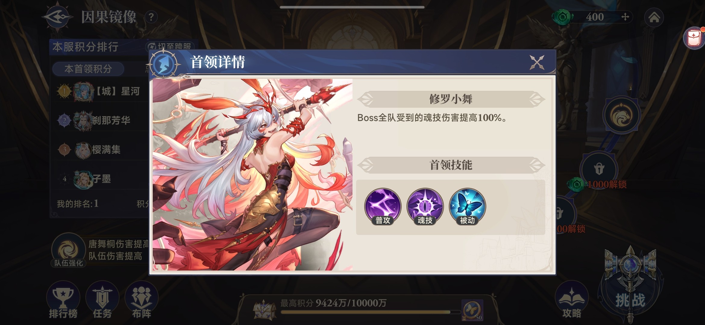 因果镜像秘境有两个首领怪,其中修罗小舞由单个队伍挑战,唐舞桐由两个队伍挑战。以修罗小舞为例,分析一下这个副本打法。