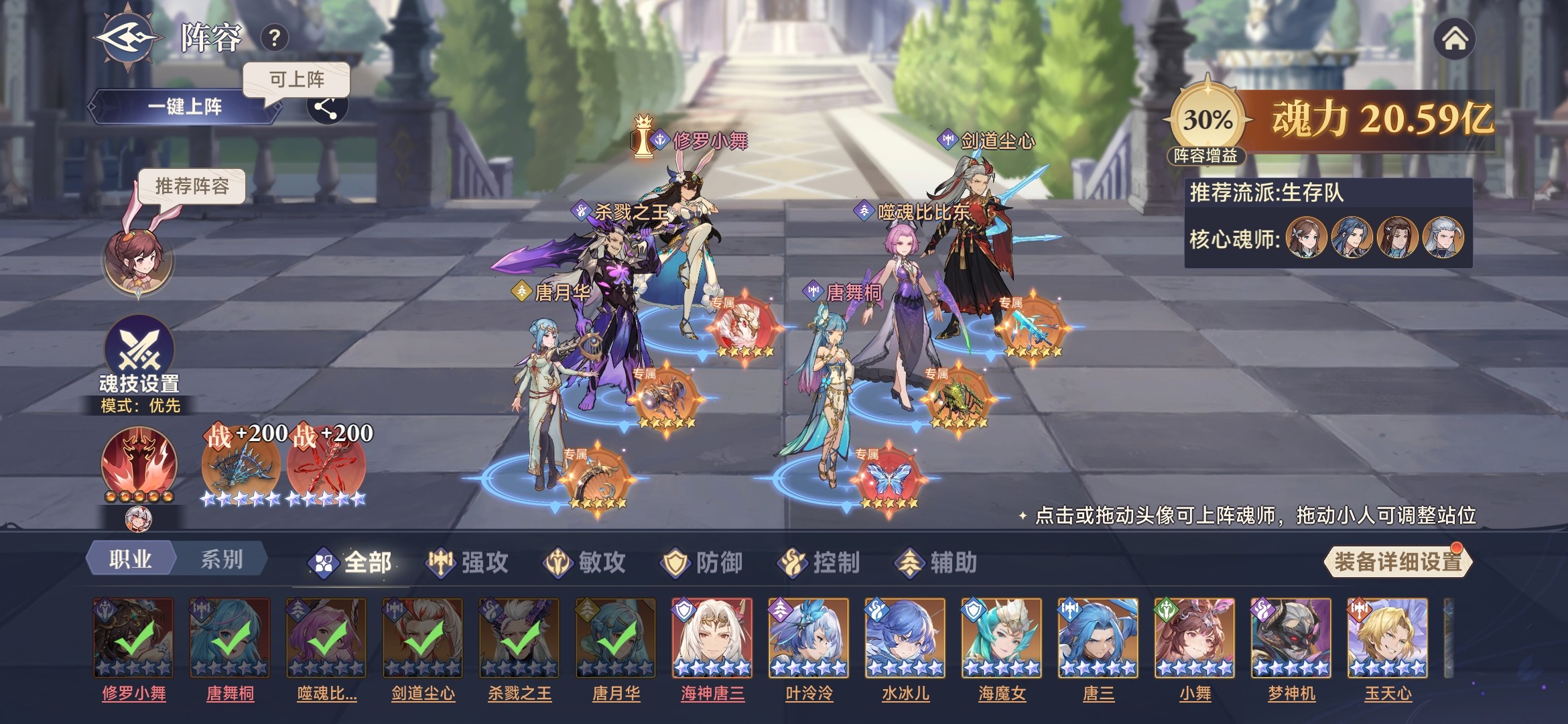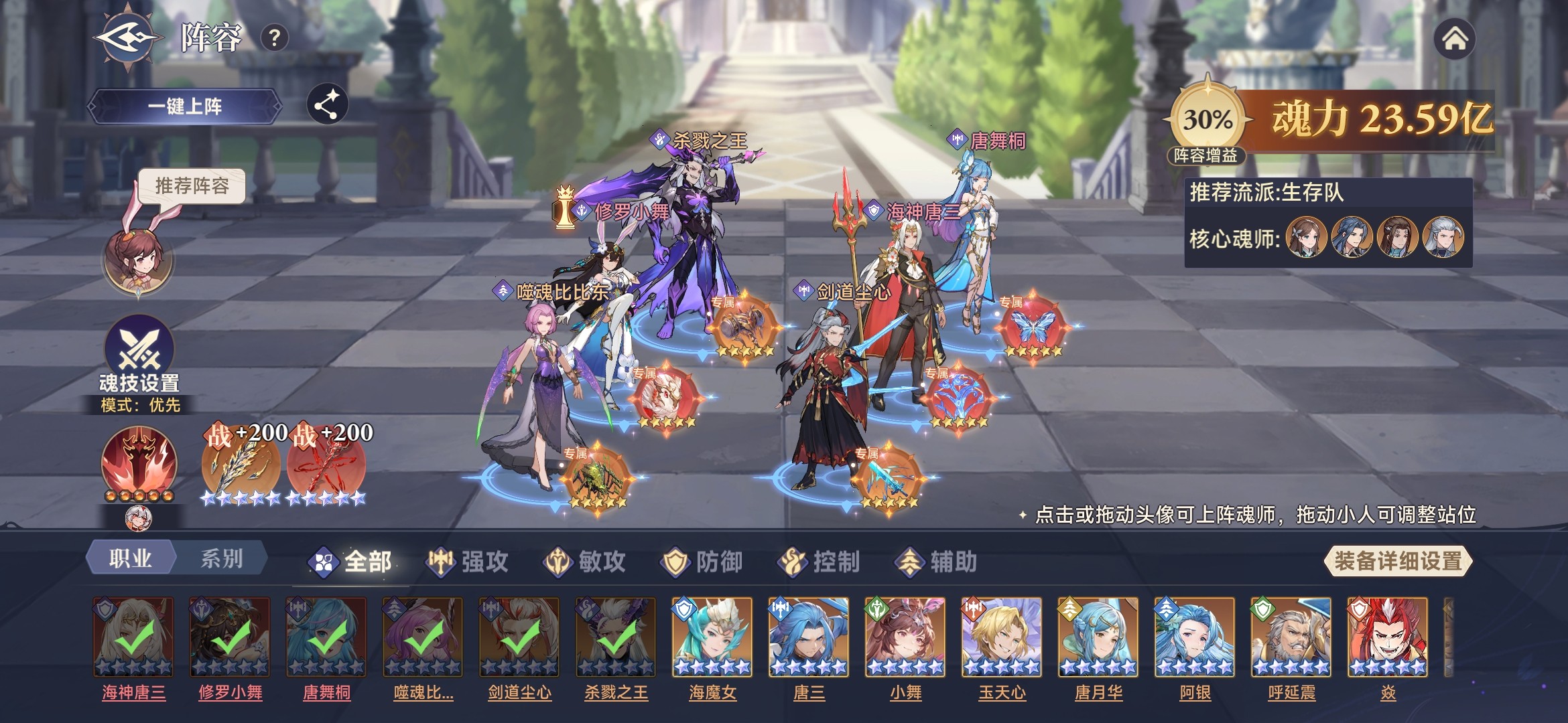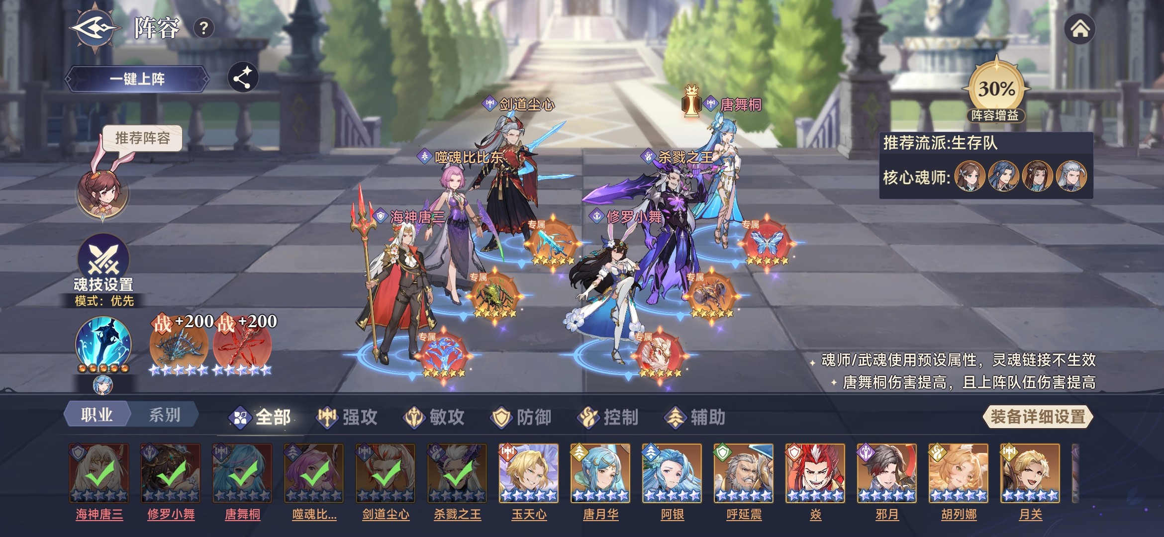 此时,唐舞桐基本功能都具备,拥有魂技伤害、光耀、生命流失、最终增减伤等效果。所以,采用三核队,唐舞桐、修罗小舞、剑道尘心作为核心输出,杀戮之王加增伤,噬魂比比东加时空魂力、海神唐三加护盾。参考阵容如下: