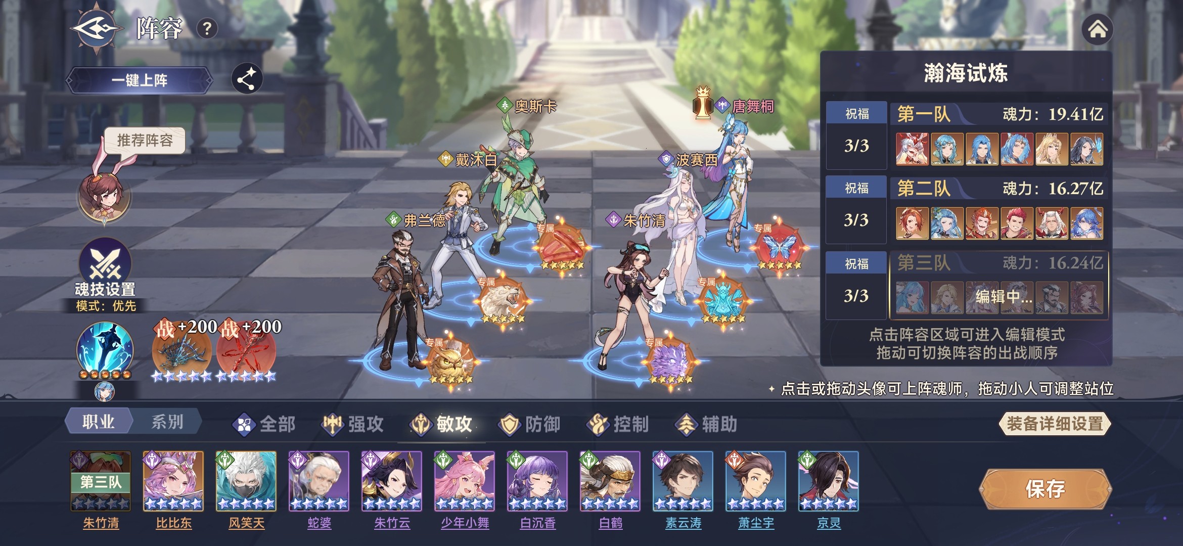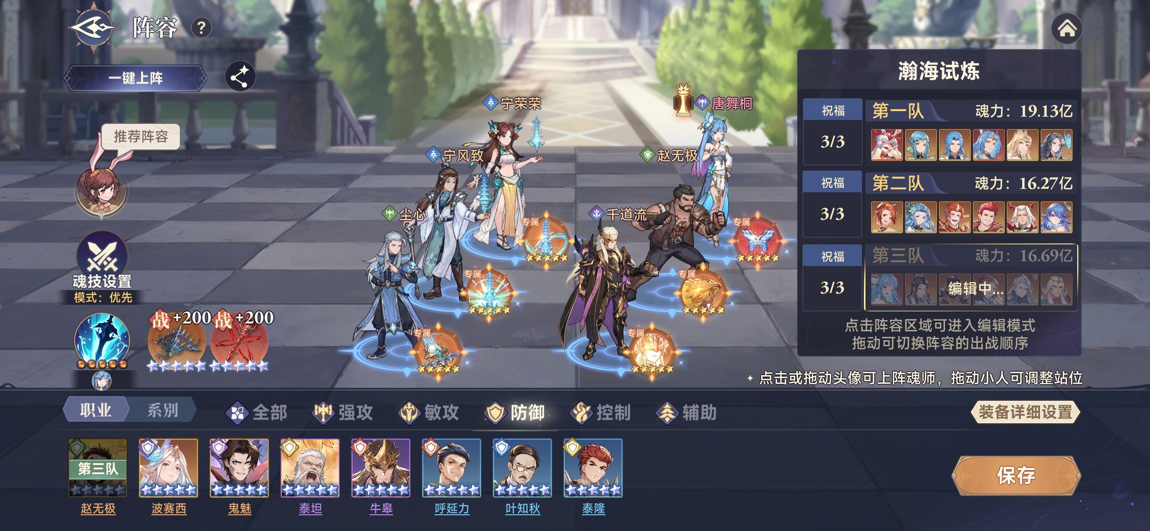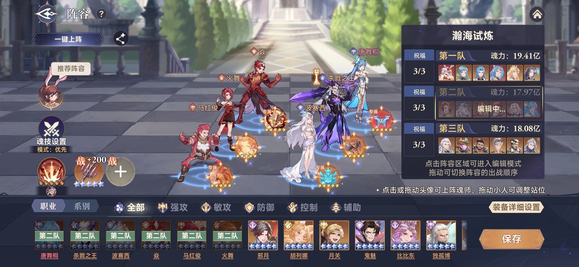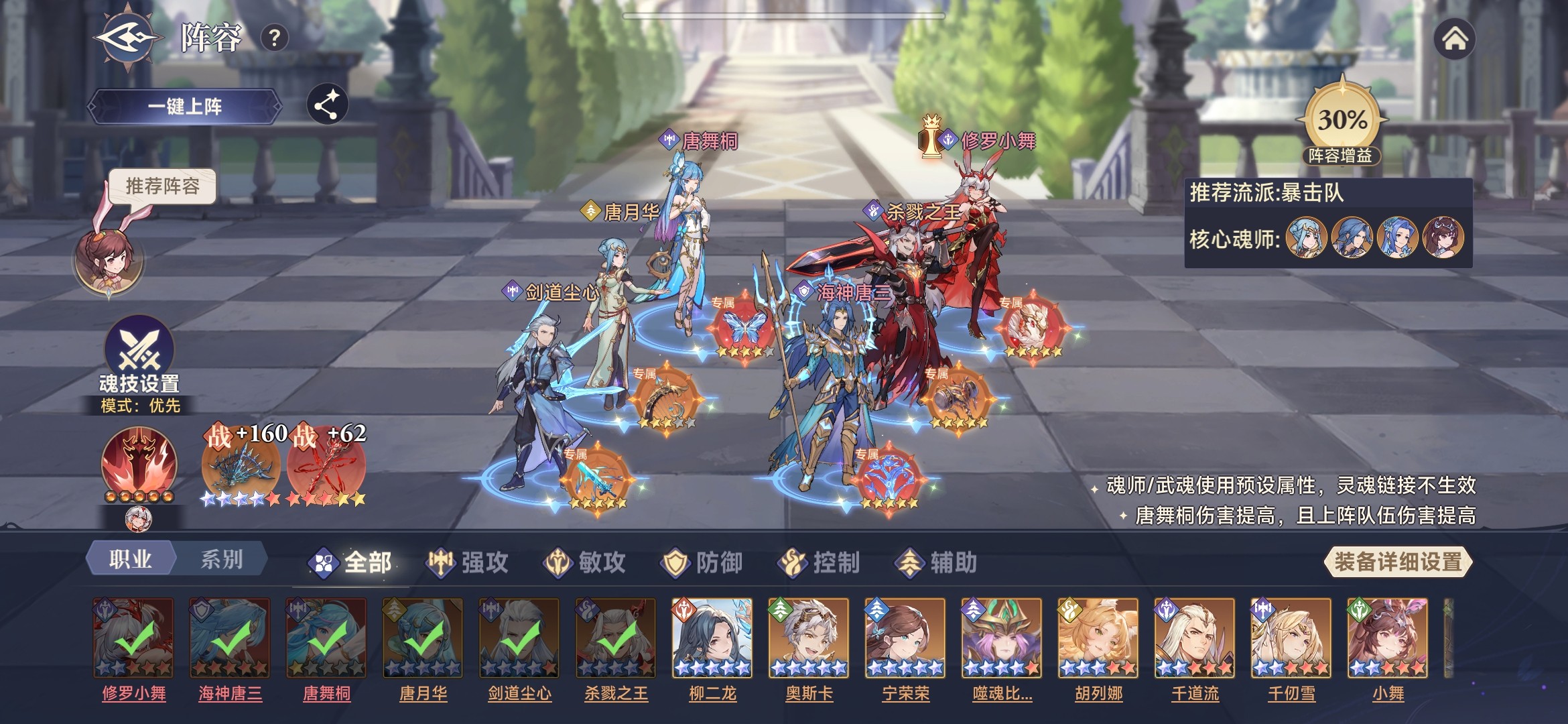 此时,唐舞桐基本功能都具备,拥有魂技伤害、光耀、生命流失、最终增减伤等效果。所以,采用三核队,唐舞桐、修罗小舞、剑道尘心作为核心输出,杀戮之王加增伤,噬魂比比东加时空魂力、海神唐三加护盾。参考阵容如下: