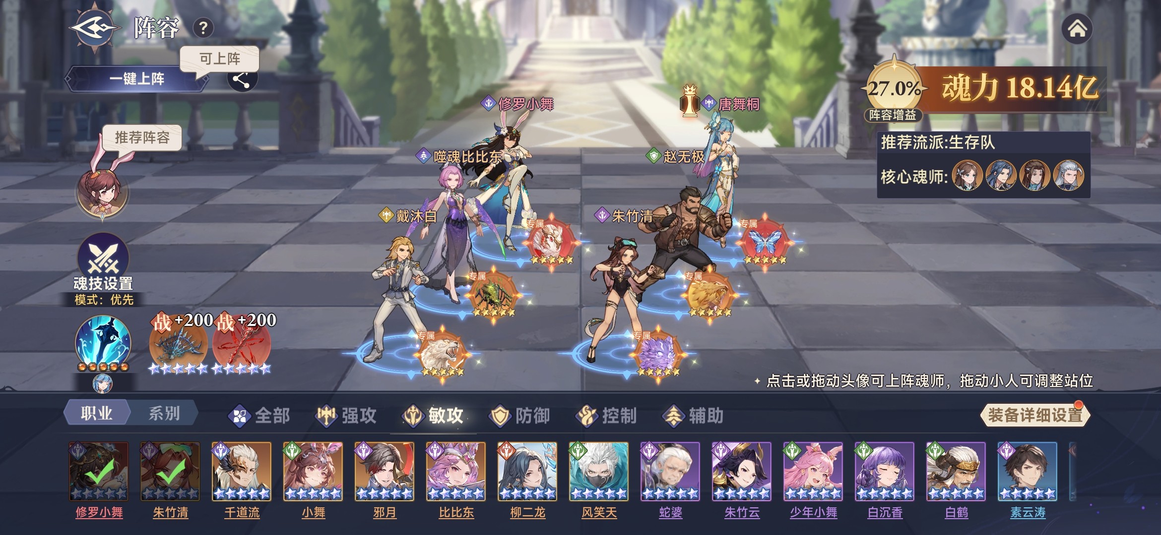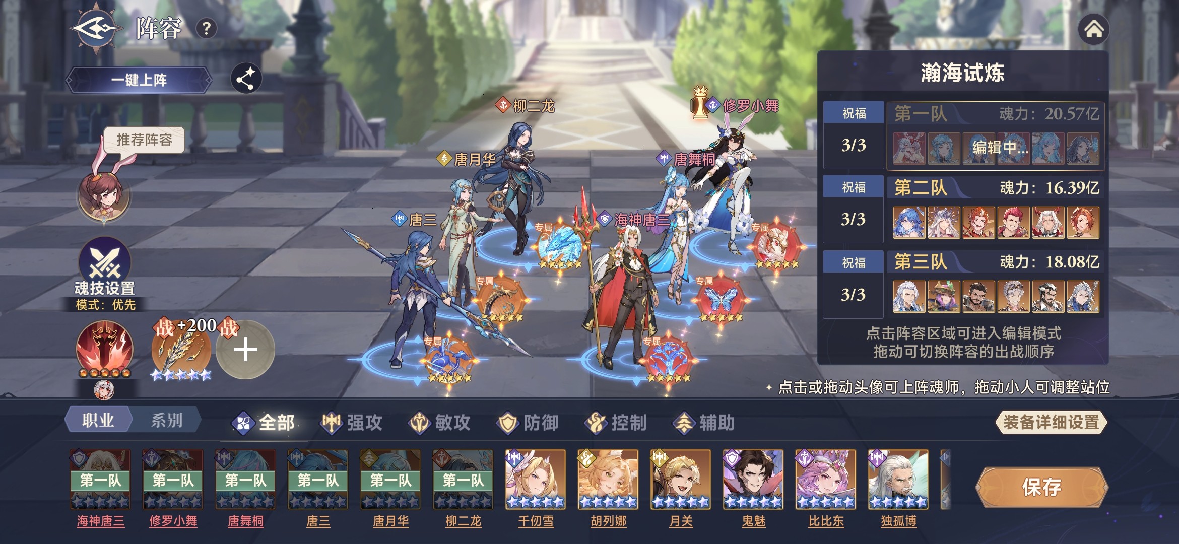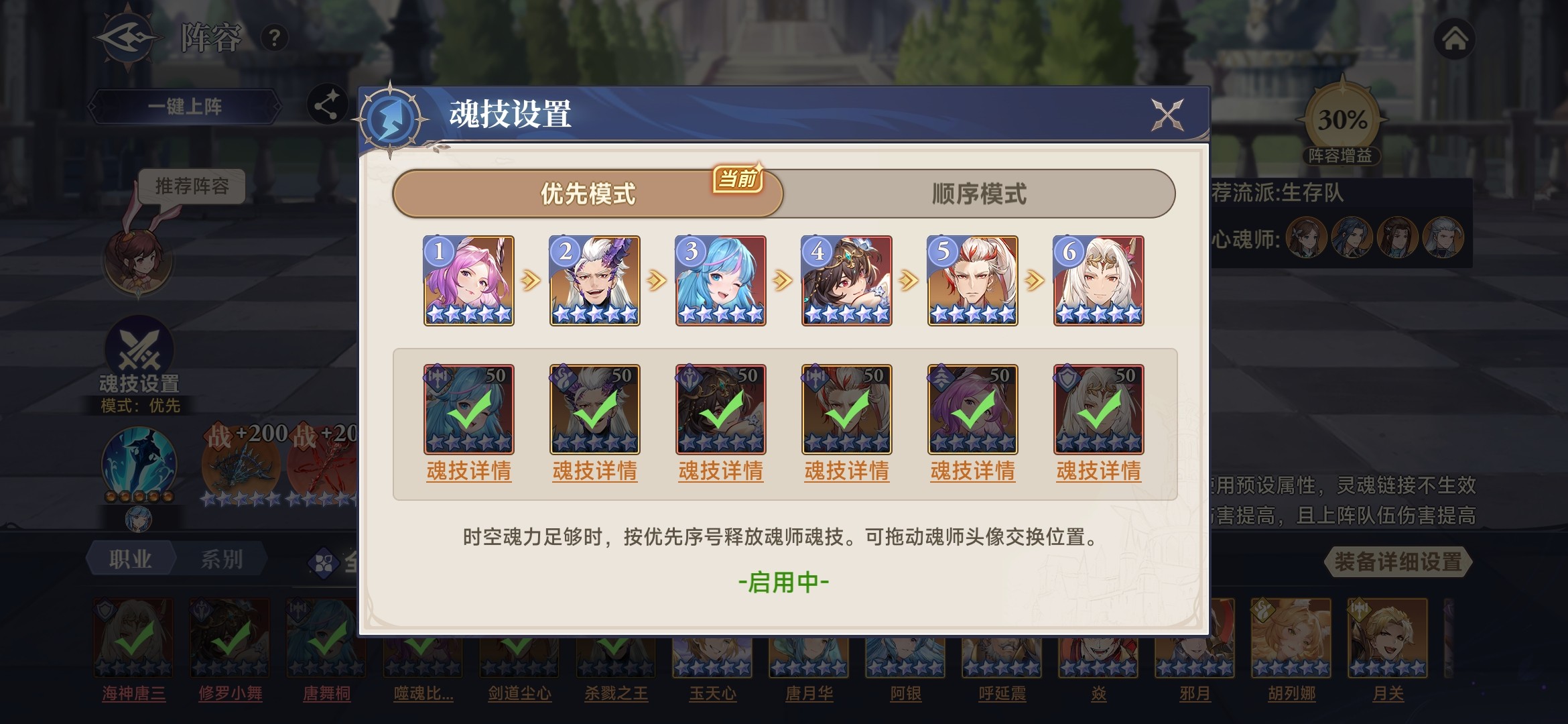 采用优先模式,噬魂比比东、杀戮之王首次释放魂技无消耗,魂技前置;唐舞桐、修罗小舞、剑道尘心依次释放魂技,积攒状态极限输出;海神唐三最后释放魂技,增加队伍坦度。