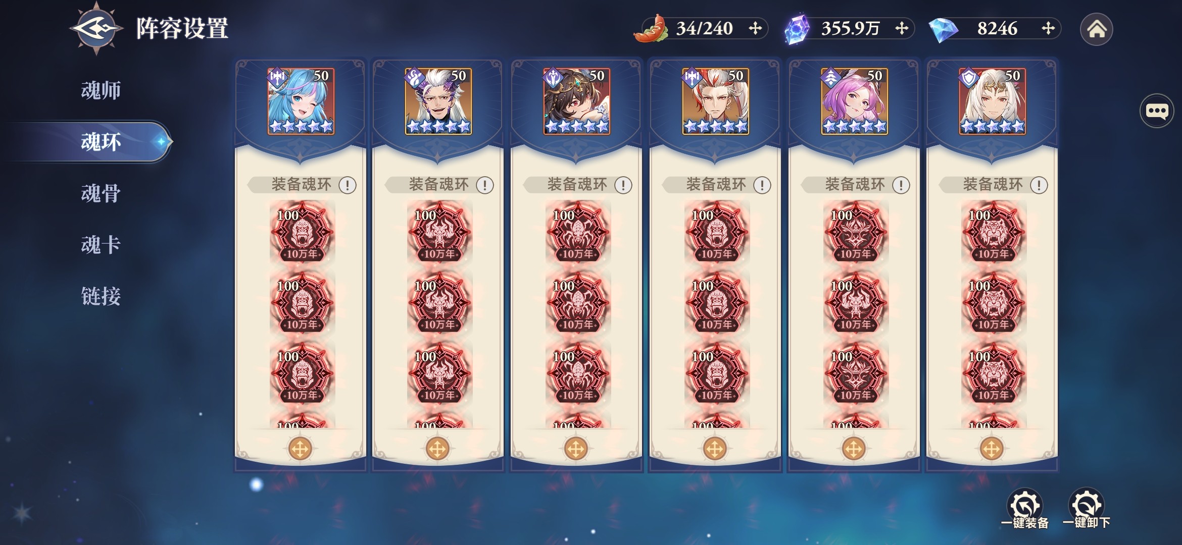 海神唐三全部带甲盾系;杀戮之王第二魂环、第五魂环选择爬行系,其他为灵兽系;噬魂比比东、唐月华等辅助魂师第二魂环、第五魂环选择爬行系,其他为植物系,增加敌人受到的伤害和灼烧等异常状态。