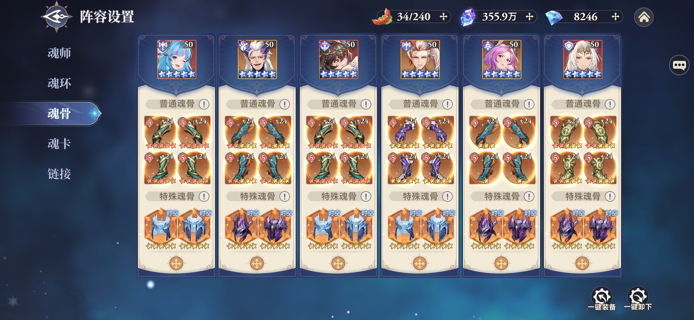 其他魂师的魂骨由系统推荐确定,外附魂骨都选择烈火杏娇疏,而时空魂师搭配时空外附魂骨—八角玄冰草、暗魔邪神虎,能够最大限度的为全体提供增伤和减伤。