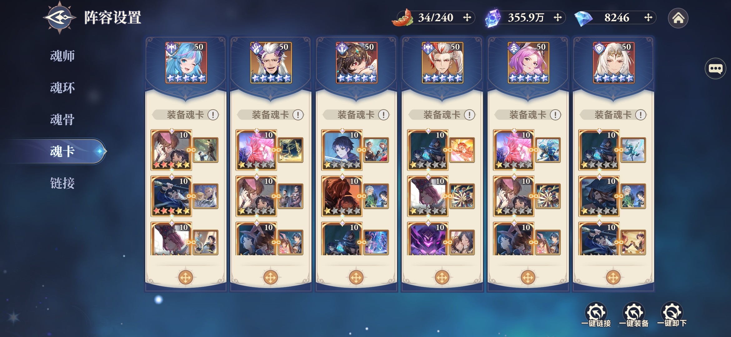 ②联结机制,根据链接魂师品质和星级,按百分比的形式,为全体魂师加攻击、防御、生命、伤害提升,最高加50%。