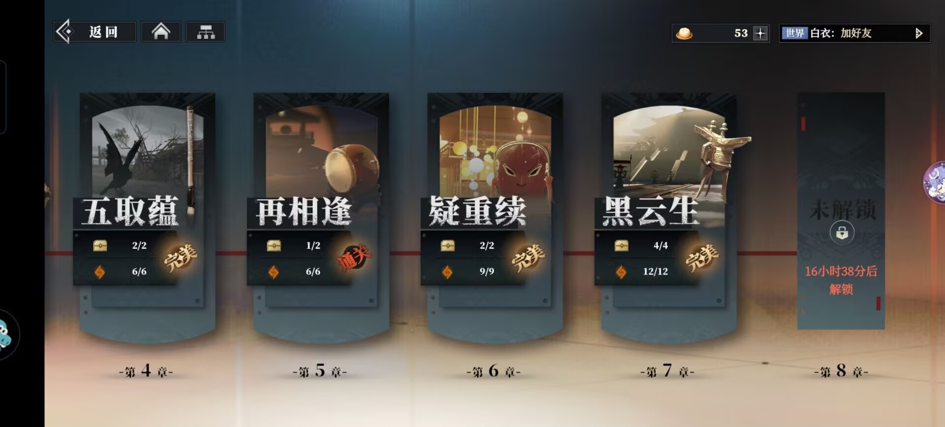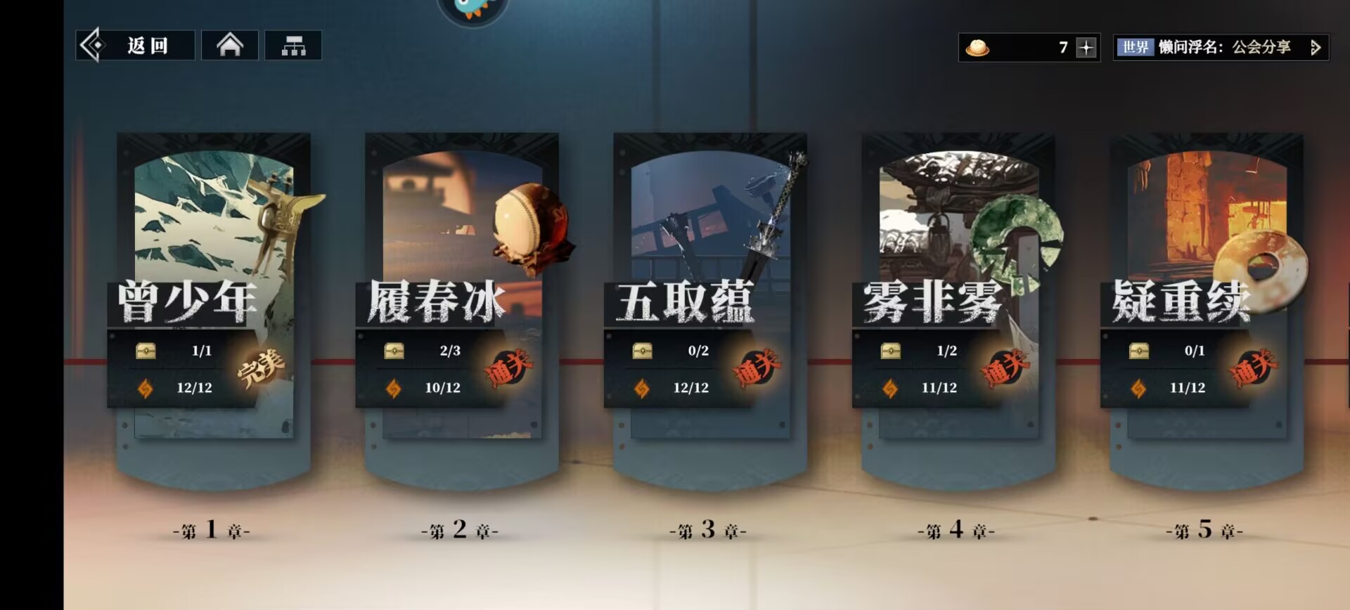 ①第一天主线进度情况:通关第七章(第二天才开启第8章)。
